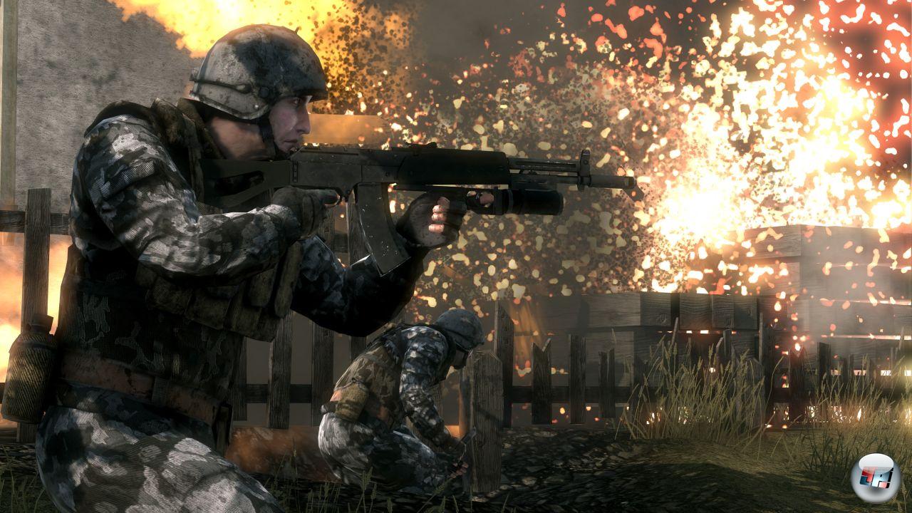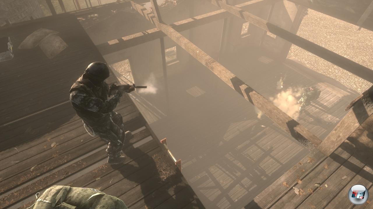 Grundriss der meisten Häuser immer gleich. Und obwohl offene Schlachtfelder das Hauptmerkmal der Battlefield-Serie sind, hätte es im Rahmen der Kampagne sicher nicht geschadet, das Geschehen auch mal in einen größeren Gebäudekomplex zu verlegen, wie man es ansatzweise beim Präsidentenpalast versucht. Etwas enttäuschend ist zudem die Schattendarstellung, die hier ähnlich grob ausfällt wie zuletzt bei Metal Gear Solid 4 und auch manche Clipping-Fehler, in denen Soldaten halb durch Häuserwände ploppen, hätten nicht unbedingt sein müssen. So erlebt ihr insgesamt in den Gefechten keinen Grafik-Overkill, doch angesichts der teils riesigen Karten und den enormen, wenn auch eingeschränkten Zerstörungsmöglichkeiten kann man den Entwicklern trotzdem gratulieren. Noch mehr Lob haben sich jedoch die Audio-Designer verdient, die mit krachenden Soundeffekten euer Zimmer glaubhaft in einen Kriegsschauplatz verwandeln. Zwar scheppert es nicht ganz so heftig wie in Frontlines, doch werden die markerschütternden Explosionen – und davon gibt es nicht wenige – euren Subwoofer ganz schön ins Schwitzen bringen. Auch die Schusswaffen klingen exzellent und zeichnen sich alle durch ihren charakteristischen, individuellen Sound aus, der nach dem Betätigen des Abzugs meist eindrucksvoll nachhallt. Vom Soundtrack gibt es dagegen leider nur selten was zu hören – doch wenn er erklingt, unterstützt er die Action auf dem Bildschirm jederzeit passend.