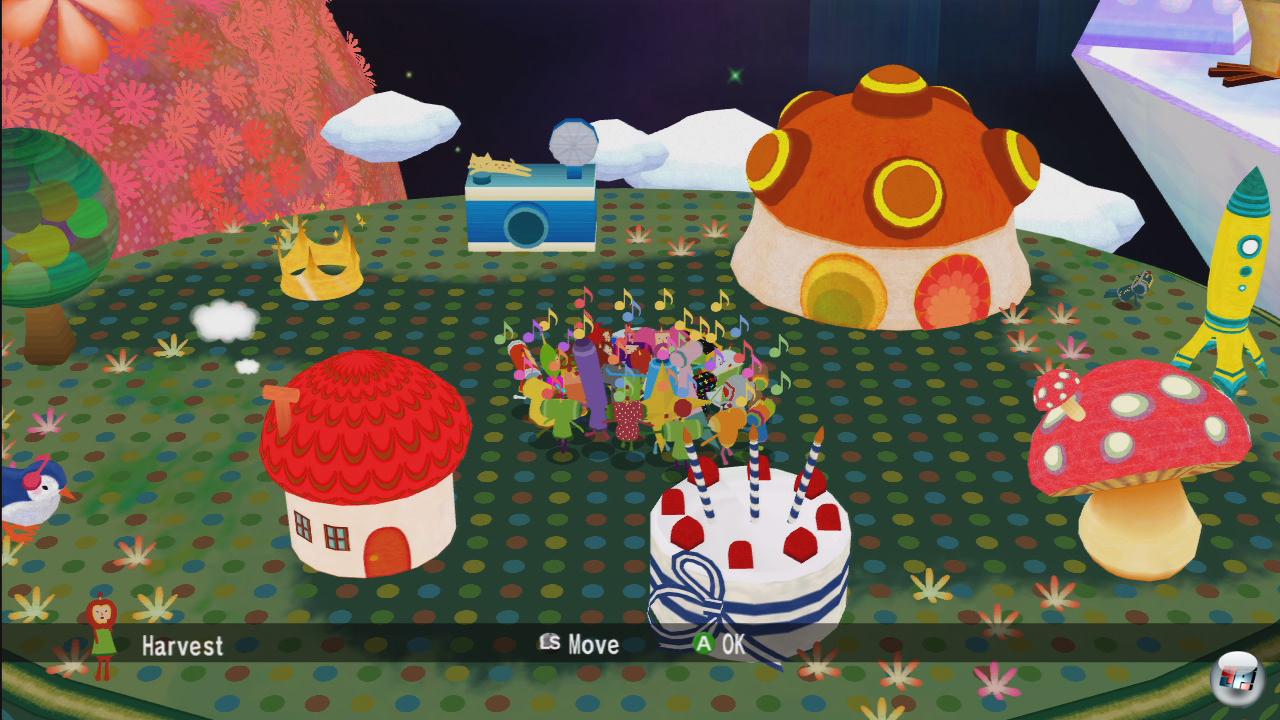 Selbst die Menüs sind wunderbar verspielt: Im Princedom (Papa hat dem Sohnemann sein eigenes Reich als Stützpunkt erschaffen) watscheln der Prinz und seine freigespielten Cousins über quietschbunte Miniasteroiden – am Pilz gehts zum Xbox Marktplatz, über eine überdimensionierte Kamera führt zu den im Spiel gemachten Fotos, im Baum hängen alle bisher aufgerollten Gegenstände und mit der Rakete geht’s nach Katamrius. Ist doch klar: Das ist die Onlinewelt der Blaublüter! Drei Gäste dürfen dort große Bälle kicken, über Emoticons kommunizieren, mit Farbe an den Füßen malen, und sobald der Gastgeber an den Pilz tritt, startet die Partie. Dann tritt allerdings wieder Ernüchterung zu Tage, denn in den Sphären von Xbox Live darf man lediglich gegeneinander und auf gerade mal fünf Karten antreten. Wer im vorgegebenen Zeitrahmen den größten Katamari rollt, gewinnt.