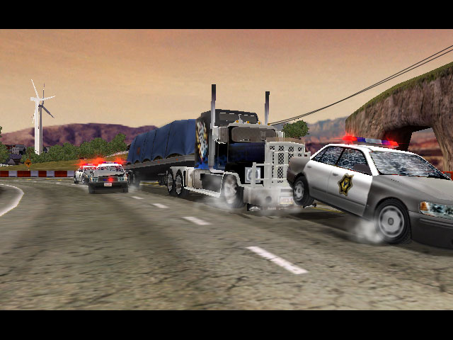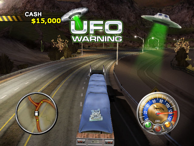 Brummi so schnell es geht zum Ziel, wo euch – ebenfalls bekannt aus dem Sega-Titel – eine kleine Einparkübung erwartet. Bis es so weit ist, müsst ihr euch allerdings mit einigen Problemen auseinandersetzen, denn so ziemlich jeder will euch ans Leder oder die Ladung. Das fängt bei nervigen Gesetzeshütern an, geht weiter über Biker-Banden, die euch eure Ladung stehlen wollen und hört bei Ufos(!) auf, die ebenfalls hinter eurer Fracht her sind. Klingt ziemlich abgedreht? Ist es auch! Um die Gegner aus dem Weg zu räumen, reicht es leider nicht aus, einfach alles mit der Fahrerkabine platt zu walzen, da eure Zugmaschine bei zu vielen Kollisionen Schaden davon trägt und euch langsamer macht. Stattdessen rempelt ihr per Knopfdruck mit dem umher schleudernden Anhänger unerwünschte Zeitgenossen und andere Verkehrsteilnehmer aus dem Weg und kassiert dafür fette Bonuspunkte, wenn ihr es vor Ablauf des knappen Zeitlimits zu eurem Ziel schafft. Leider bieten nur die drei Außenperspektiven die dafür notwenige Übersicht, da die Cockpit-Ansicht über keinen Rückspiegel verfügt, mit dem ihr den Hänger im Auge behalten könntet.