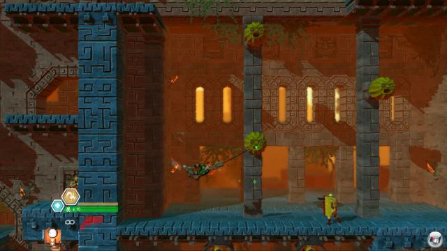 Bitte nicht falsch verstehen: Ich mag anspruchsvolle Plattformer, ich beiße mich auch gerne in Steuerungen hinein , aber dann muss ich dafür belohnt werden! Das Spiel darf nicht in einfachen Situationen so oft unterbrochen werden. Warum kann ich nicht in einem flüssigen Ablauf von Plattform zu Plattform schwingen? Ja, das klappt auch hier, das Spiel ist ja kein Totalabsturz, aber es funktioniert nicht gut und oft genug. Warum werde ich in meinen Aktionen so oft unterbrochen, muss umständlich immer wieder das Seil ausfahren oder den Arm bzw. Analogstick ausrichten? Hätte man die Kontrolle nur etwas freier und verzeihlicher gestaltet, würde man nicht so oft in den weit verschachtelten, verdammt hohen Arealen abstürzen – das vergrößerte Design der Welt zwingt noch mehr zur vertikalen Erkundung. Man stürzt zwar nicht im Sekundentakt, aber innerhalb eines Levels immer wieder an blöden Stellen – nicht weil das Ganze so schwierig wäre, sondern weil sich das Ganze so chaotisch anfühlt.