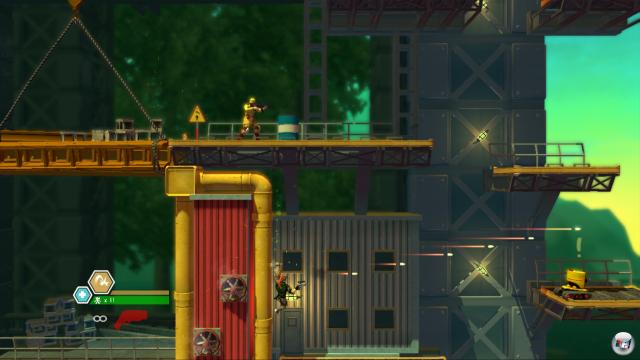 In Nathan Spencers adretter Uniform samt neuem Schnäuzer fühlt man sich nämlich nicht agiler, sondern steifer und beschränkter – Trine <a class="DYNLINK" onmouseover="DynToolTipp_Show('Klicken für Gameinfos‚)“ onmouseout=“DynToolTipp_Hide(); “ href=“javascript:DynCont_Display(‚Gamefinder‘,’runmod.php?sid=%7BSID%7D&LAYOUT=dyncont_gf&spielid=250548′)“> und Shadow Complex <a class="DYNLINK" onmouseover="DynToolTipp_Show('Klicken für Gameinfos‚)“ onmouseout=“DynToolTipp_Hide(); “ href=“javascript:DynCont_Display(‚Gamefinder‘,’runmod.php?sid=%7BSID%7D&LAYOUT=dyncont_gf&spielid=364788′)“> spielen sich dagegen wie visionäre Plattformer. Warum kann ich meinen Greifarm nicht präziser und freier auswerfen? Warum muss ich im Gegensatz zum Vorgänger auch noch einen Knopf drücken? Man kann ihn nur gerade nach oben, direkt vorwärts oder schräg im 45-Grad-Winkel abfeuern, um Simse, Dächer oder Gegenstände wie Fässer in die Fänge zu bekommen. Was sich simpel und ausreichend anhört, ist aber in der Praxis mit dem Analogstick plus Knopfdruck zu fummelig: In der Hitze des Gefechts verzeiht das Spiel keinen einzigen Pixel Abweichung, sonst hält der Greifer nicht. Das führt dazu, dass der Arm quasi wie eine Schlange heraus schnellt, immer wieder, bis man endlich mal hat, was man haben will. Warum gestaltet man das nicht intuitiver?