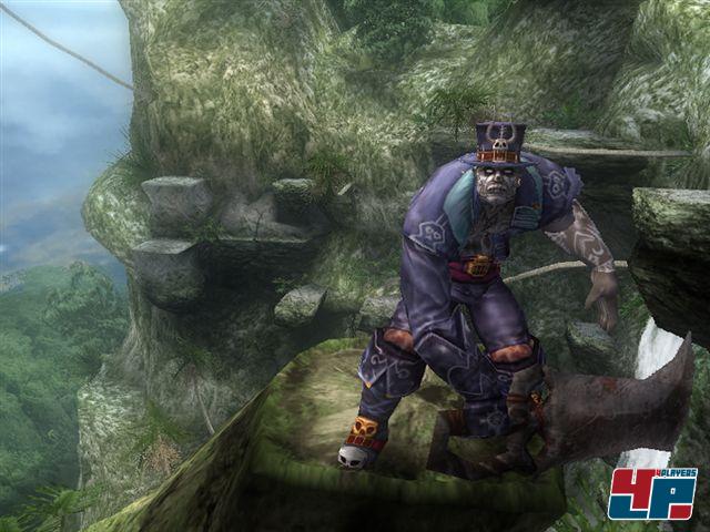 Ab und zu trefft ihr auf Gegner wie unterschiedlich große Zombie-Affen mit leuchtend roten Augen und andere Fantasiekreaturen. Leider geben einige der Primaten etwa ein mal pro Sekunde ein nerviges Kreisch-Sample von sich, das ihr im Laufe des Abenteuers mehrere tausend mal erdulden müsst. Eure Widersacher bearbeitet ihr mit einem Säbel und der Pistole, die nach dem Schuss ein wenig Zeit zum Nachladen benötigt. Im Laufe des Spiels lernt ihr unterschiedliche Kombos für eure Fechtwaffe. Doch meist reicht es, sich vor den Gegner zu stellen und auf die Buttons zu hämmern. Außerdem könnt ihr einen Voodoo-Zombie beschwören, der auf die Gegner zuhumpelt, sich in ihnen festbeißt und euch so ein wenig Arbeit abnimmt. Ihr fragt euch, warum Francis Zombies erscheinen lassen kann? Weil er zu Beginn des Abenteuers ein Amulett findet, mit dem er magische Kräfte entwickelt und sich in den namensgebenden Black Buccaneer verwandeln kann. Der bullige Voodoo-Priester mit weißer Gesichtsbemalung und dem Zylinder kann zaubern und mit seinem Schwert deutlich kräftiger zulangen als Francis.