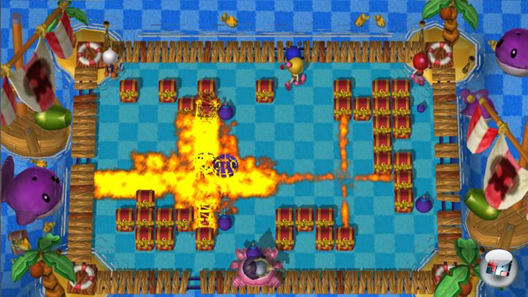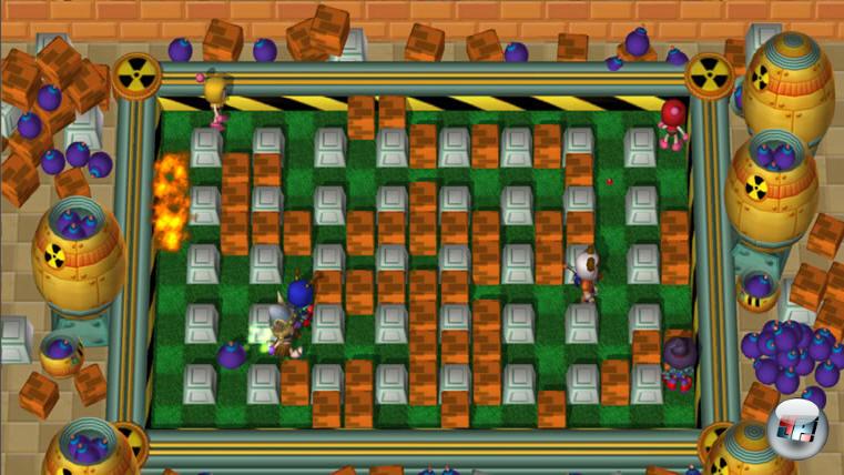 und auch der Spielablauf macht endlich wieder Spaß. In traditioneller Draufsicht duelliert ihr euch mit bis zu sieben putzig animierten Rivalen in rechteckigen Arenen, kämpft um frei gebombte Power-Ups und versucht als letzter unversehrt zu bleiben.