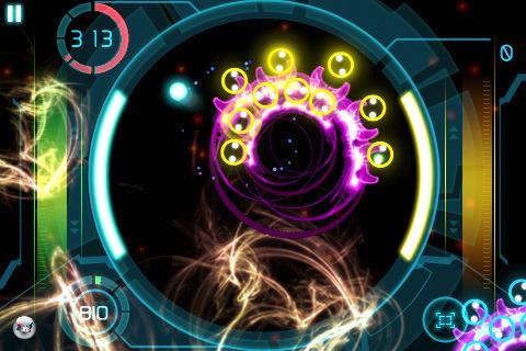 Doch es gibt auch fiese Hindernisse, u.a. Vernichter, die mit Energiekugeln auf die Schläger schießen. Wenn sie treffen, sinkt die verbleibende Zeit so merklich, dass man den Level oft schon nach zwei oder drei solcher Treffer von vorn beginnen muss. So wechselt man stets zwischen geschicktem Einsammeln und schnellem Ausweichen, was dank der direkten Steuerung meist hervorragend funktioniert. Andere Hindernisse und Hilfen befinden sich mitten unter den Mikroben. Da sind z.B. Helfer, welche die um sie liegenden Mikroben schwächen. Da sind aber auch Regeneratoren, die geschädigte Mikroben heilen. Aktiviert werden diese beiden „Kreaturen“ durch einen Treffer. Gravitationsfelder, welche die Flugbahn der Kugel ablenken, wenn sie ihnen nahe kommt, sind hingegen durchgehend aktiv.