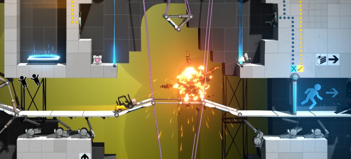 Größter Kritikpunkt ist aber die magere Anzahl der Bauteile (Stahlstreben und Seile) sowie der Testfahrzeuge. Hier hätte mehr Vielfalt sicher gutgetan, zumal die ordentliche Physik-Engine das sicher gemeistert hätte. Der Anspruch kommt vielmehr durch den Aufbau der Testkammern und die dortigen Aperture-Technologien, wobei in der Regel meist klar ist, was zu tun ist. Man muss sich „nur“ überlegen, wie das Ziel zu erreichen ist. Erst im späteren Drittel wird es knackiger.