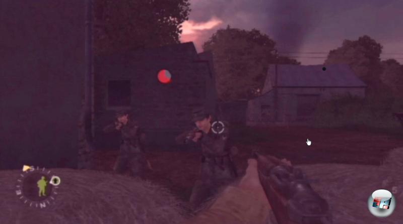 Ihr schleicht um Scheunen herum, greift die Deutschen auf dem Hof einer Kirche an und kämpft euch über Felder und Wiesen. Ab und zu ballert ihr die anrückende Übermacht auch mit einem MG über den Jordan oder jagt ein feindliches Geschütz in die Luft. Natur und Dörfchen sind detailverliebt nachempfunden, wirken aber dank matschiger Texturen trotzdem alles andere als hübsch – auch für Wii-Verhältnisse. Mal dient ein Erdwall als Deckung, mal ein paar Mauern oder andere Hindernisse. Die Gegenstände lassen sich zwar noch nicht zerstören wie im aktuellen Teil, andererseits sind die Levels von anno dunnemals sehr motivierend aufgebaut. Verlaufen könnt ihr euch nicht und trotzdem lässt die Umgebung euch meistens genug Spielraum, um eure Angriffe zu variieren.