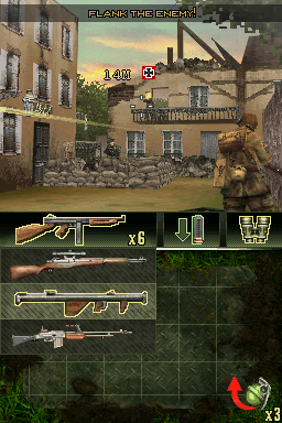 Wie kann ich meinen virtuellen Waffenbrüdern Befehle erteilen? Die Antwort ist einfach: gar nicht. Ubisoft bricht mit der Serientradition und entscheidet sich dafür, extra für Nintendos DS einen unkomplizierten Militär-Shooter im Stil der genannten Konkurrenten von Electronic Arts und Activision herauszubringen. Keine strategischen Entscheidungen, kein Nachdenken. Ihr braucht lediglich einen flinker Finger und ein geschicktes Händchen am Stylus, um nicht im unbarmherzigen Dauerbeschuss der „Krauts“ unterzugehen. Denn die mit detaillierten Texturen verzierten Nazi-Bösewichte kennen weder Gnade noch Pause und greifen euch unablässig von allen Seiten an.