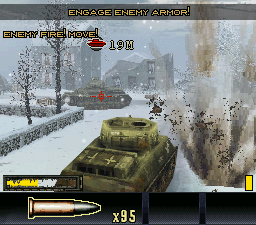 Noch länger als der Charakter hält der Panzer durch, in den ihr von Zeit zu Zeit steigen dürft. Die Panzerfahrten sind das Highlight des Spiels. Es macht einfach tierischen Spaß, durch das Terrain zu donnern und die gegnerischen Tanks, Geschützstellungen, Bunker und flüchtende Soldaten im Sekundentakt zum Teufel zu jagen. Die gelungenen Soundeffekte lassen das ganze übrigens recht realistisch wirken. Das typische pathetische Helden-Orchester gibt es zum Glück nur in den Menüs zu hören. Im Spiel lauscht ihr dagegen nur den Explosionsgeräuschen, den Schreien eurer Gegner und dem Quietschen der Panzerketten.