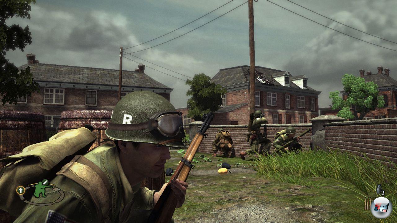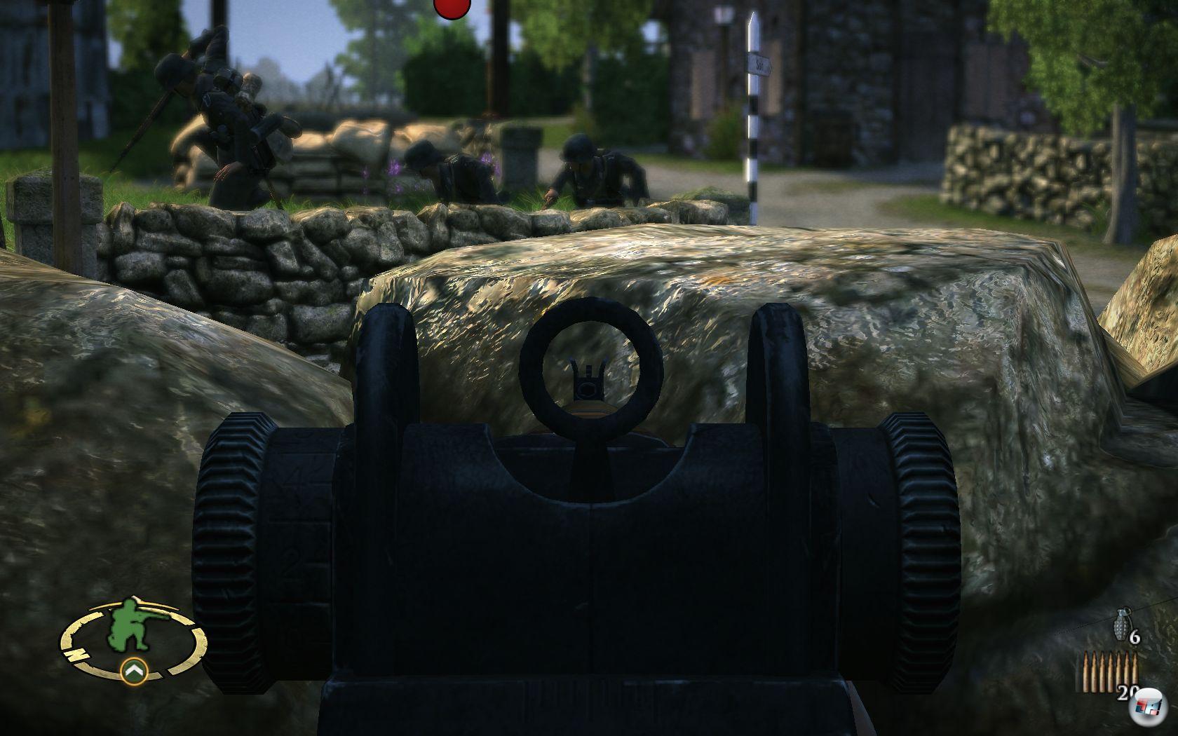 | Während eure Kameraden die Deutschen mit Sperrfeuer einheizen, schleicht ihr euch über die Flanke heran. |