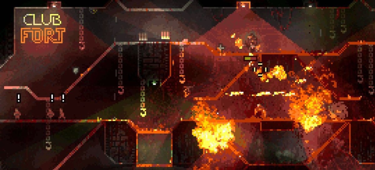 Und das wird in dieser als 2D-Shooter mit Twinstick-Steuerung konzipierten Action häufig passieren. Man wird abgeschossen. Man schätzt einen Sprung falsch ein und landet in der Lava. Man wird abgeschossen. Man wird von Fallen in der Umgebung geröstet, zerquetscht oder zersägt. Man wird abgeschossen. Und in die Luft gesprengt. Wieder und wieder. Es sei denn, man entscheidet sich für den „Casual“-Schwierigkeitsgrad („I Cry When I Die“), bei dem man deutlich weniger Gesundheit bei Treffern verliert oder die Gegneranzahl leicht verringert ist. Doch selbst in diesem Puschel-Modus wird man auf die eine oder andere Situation treffen, in der man sich nur mit einem herzhaften Fluchen zu helfen weiß, bevor man einen neuen Versuch unternimmt. Und auf den Stufen „Hard“ (Standard), „Harder“, „The Hardest“ und dem erst freizuschaltenden „Impossible“ sieht man zunehmend kein Land mehr – selbst und gerade weil jeder der sorgsam von Hand gestalteten Abschnitte samt Arenen und Sprungsequenzen theoretisch im Schnitt in etwa zwei bis dreieinhalb Minuten erledigt sein kann.