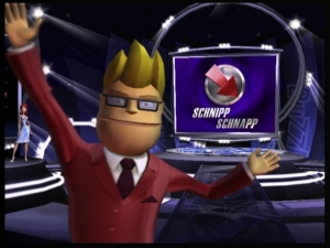 Die Präsentation war schon im ersten Teil nicht die Stärke des Spiels, erfüllt ihren Zweck nach wie vor aber gut – und poliert sowohl die Figuren, allen voran Showmaster Buzz samt Assistentin Rose, als auch das Studio mit mehr Details und schöneren Effekten angenehm auf. Buzz hat jetzt auch eine neue Stimme, die das Geschehen nicht mehr so schlafmützig wie der Vorgänger kommentiert – schade nur, dass man nicht das englische Original wählen darf, dort erwartet den »Neighbours«-Fan nämlich der australische Akzent von Jason Donovan. Und natürlich gibt es frische Kandidaten: Neben den bekannten Gesichtern, die im witzigen Intro ins Studio gelockt werden, gibt es neue Medienopfer, die wie gewohnt realen Vorbildern nachempfunden wurden – in diesem Fall Personen wie Napoleon, Einstein, Bruce Lee oder Michael Jordan.