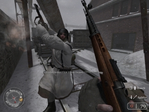 Die brachialen Soundeffekte wurden bereits erwähnt, der Rest der Akustik soll nicht vergessen werden: Die Sprachausgabe ist größtenteils hervorragend gelungen, die teilweise mit Akzent sprechenden Kameraden und Feinde melden sich dauernd und lautstark zu Wort – interessanterweise beziehen sie sich dabei gelegentlich auf die Position des Spielers bzw. angreifender Feinde. Sprüche wie »Sowjetische Truppen! Bei der zerfallenen Mauer!« oder »Deutsche! Da drüben bei dem LKW!« verleihen dem Geschehen einen zusätzlichen Zacken Glaubwürdigkeit. Besonders bedrückend sind dabei die jederzeit hörbaren Propaganda-Sprüche der Nazis in der russischen Kampagne. Dazu gibt es im Menü noch gute und dramatische Musik, die etwas Moll-lastiger als üblich ist und ohne die sonst unvermeidlichen Trompeten-Soli auskommt. Innerhalb des Spiels bekommt ihr nur wenige Noten zu hören – nur wenn eine Mission oder zumindest wichtige Teilmission vollständig erledigt wurde, gibt es gewissermaßen eine akustische Belohnung.