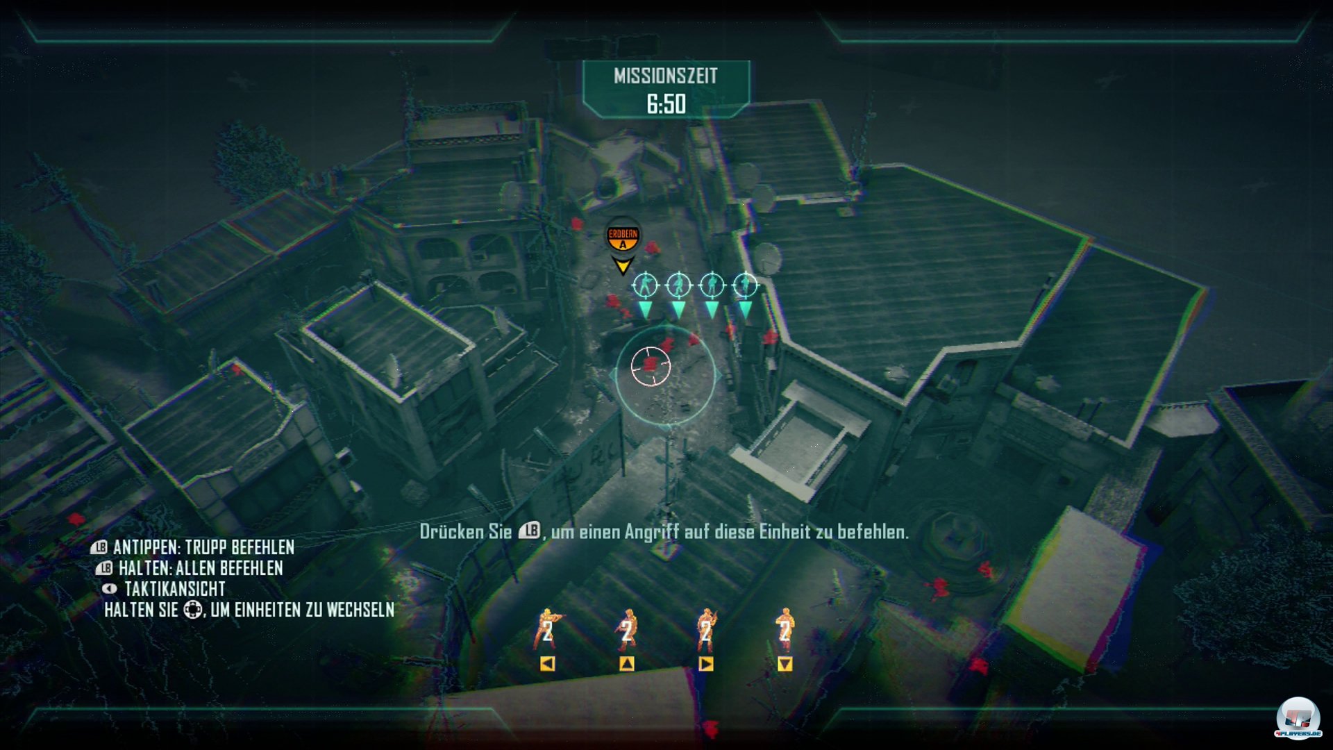 Ein komplett neues Element der Kampagne nennt sich Eingreiftruppe – und wenn ich schon vom Solo-Abenteuer an sich abrate, dann gilt das doppelt und dreifach für diese Pseudo-Strategie. Erinnert ihr euch an die „Stage Battles“ in Brütal Legend? Fandet ihr die gut? Falls ja: Herzlichen Glückwunsch, tragt euch hier bei der Eingreiftruppe ein. Ich fand die immer furchtbar. Und so geht es mir hier auch: Theoretisch könnte das eine Art Mini-Full Spectrum Warrior sein; aus der Vogelperspektive kann man seinen Einheiten, einzeln oder dem ganzen Trupp, Anweisungen geben, ihnen den Zugriff vorschreiben oder sie an verschiedene Positionen schicken. Praktisch allerdings ist das System eine Katastrophe: Die Steuerung zuckt herum, die Truppen ignorieren Befehle. Die einfachste Lösung ist daher, sich direkt in eine Einheit reinzubeamen und ganz normal aus der Ego-Perspektive herumzuballern.