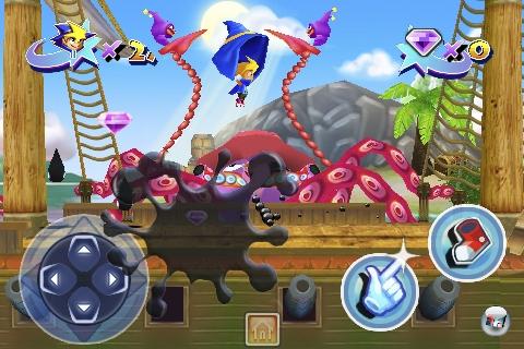 Erinnert sich einer der Mitlesenden an den 1990er Mega Drive-Klassiker »Castle of Illusion«, in dem Mickey Mouse seine von einer bösartigen Hexe entführte Freundin befreien muss und dabei durch allerlei verrückte Märchenwelten hopsen muss? Man ersetze die Maus mit einem blonden Jungen und die Hexe mit einem Zauberer, und schon ist das auch namentlich sehr verwandschaftliche Castle of Magic geboren – es gibt sogar ein Süßigkeitenland sowie immer wieder mal horizontal gekippte Levelteile! Während das Mausflug allerdings ein reines 2D-Spiel war, setzt Castle of Magic auf kunterbunte 3D-Grafik, die allerdings ebenfalls nur zwei Dimensionen kennt – das Spielprinzip folgt also eher dem altbewährten »Pandemonium!« (das es ja leider bislang nicht in den deutschen AppStore geschafft hat).![]()
