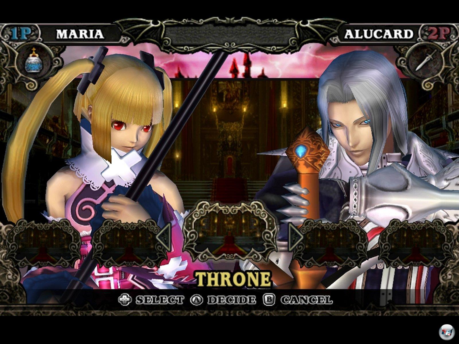 Geschichten wurden im Castlevaniaversum schon viele erzählt, hier kommt allerdings keine neue hinzu. Stattdessen werden Figuren aus allen Spielen in einen Topf geschmissen, einem Zeitriss sei gedankt, um sich gegenseitig die Hucke vollzuhauen. Am Anfang gibt es ein paar Textzeilen, am Ende einen schlauen Spruch der Marke »Ich werde nicht ruhen, bis ich Frieden gefunden habe« – und dazwischen warten obskure Kampfeinleitungen wie bei Maria Renard, die anderen weiblichen Kämpfern die Größe der Brüste neidet. Oder anders: Der Story-Modus ist nett inszeniert, aber so hohl wie die Birne von Paris Hilton. Viel interessanter ist da schon der Punkt »Schloss«, denn dahinter verbirgt sich ein astreiner Klon vom »Weapon Master«-Modus aus Soul Calibur. Mit einem freigespielten Fighter kämpft man sich durch Draculas Zuhause, um der Obersaufnase persönlich die Eckzähne zu verbeulen. Dazu zieht man von Zimmer zu Zimmer, was aber letzten Endes nur neue Kämpfe bedeutet. Die allerdings haben unterschiedliche Siegesbedingungen: Mal muss man die Gegner erledigen, mal nur Objekte einsammeln. Mal eine bestimmte Zeit lang überleben, mal eine 5er Kombo schlagen. Mal einen Fight nur mit Spezialwaffe, mal per Ring Out beenden. Diese Bedingungen sind abwechslungs- und zahlreich, dazu kommen noch unterschiedliche Handicaps, aufgrund derer man zu Kampfbeginn schwächer ist oder sich ein Gegner regeneriert. Und da hier auch noch diverse Kleidungsstücke freigeschaltet werden, mit denen man seinen Fighter verzieren kann, bleibt das Schloss am längsten in Erinnerung. Allerdings nicht nur in positiver, denn das Speichersystem ist höchst mistig: Vermasselt man einen Kampf, geht’s zur letzten Speichertür zurück – das kann schon mal bedeuten, dass man eine Handvoll Fights durch Schusseligkeit nochmal machen muss. »Zweikampf« schließlich ist die Basis jedes Prügelspiels, im Falle von Castlevania Judgment (CJ) nicht nur lokal, sondern auch online möglich – allerdings war zum Testzeitpunkt auf den Servern exakt gar nichts los, so dass wir zur Verlässlichkeit des Online-Gekloppes keine Aussagen machen können.