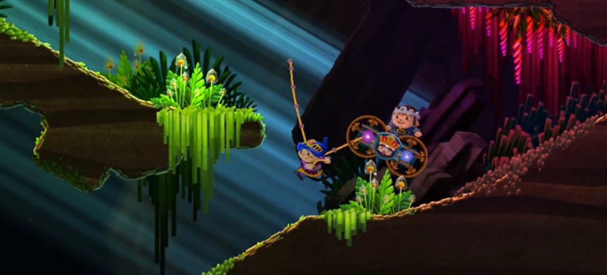 So seltsam das Konzept zunächst klingt, so erfrischend fühlt es sich an, den rollenden Raffzahn durch die Minen zu schubsen. Das praktische Seil der kräftigen Prinzessin lässt sich jederzeit wie mit einer Harpune ein- und aushaken. Ich zerre den Leichnam einen steilen Hang hinauf, löse den Haken, springe auf einen Vorsprung und klinke das Seil erneut ein. Schon kann ich die unter mir baumelnde Kiste zu mir hinauf zerren. Auf Abhängen und Rampen ergeben sich knifflige Sprünge und akrobatische Tricks, bei denen es fast ein wenig im Bauch kribbelt. „Wiiiii“ ruft auch mein untoter Passagier, der die Skate-Einlagen zu genießen scheint. Kurz darauf wird es ihm aber meist doch zu viel und er schickt ein paar Flüche hinterher. Der charmante Humor der nur manchmal eingestreuten Gags trifft genau den richtigen Ton. Für eine angenehme Herausforderung sorgen auch die optionalen Abzweigungen voller wertvoller Edelsteine und magischer Schienen. Durch manche der transparenten Bahnen kann nur die Prinzessin laufen, andere lassen lediglich den rollenden Sarg hindurch. Also hüpfe ich immer wieder schnell umher, hake das Seil ein und aus oder schwinge das schwere Gefährt kraftvoll auf Plattformen.