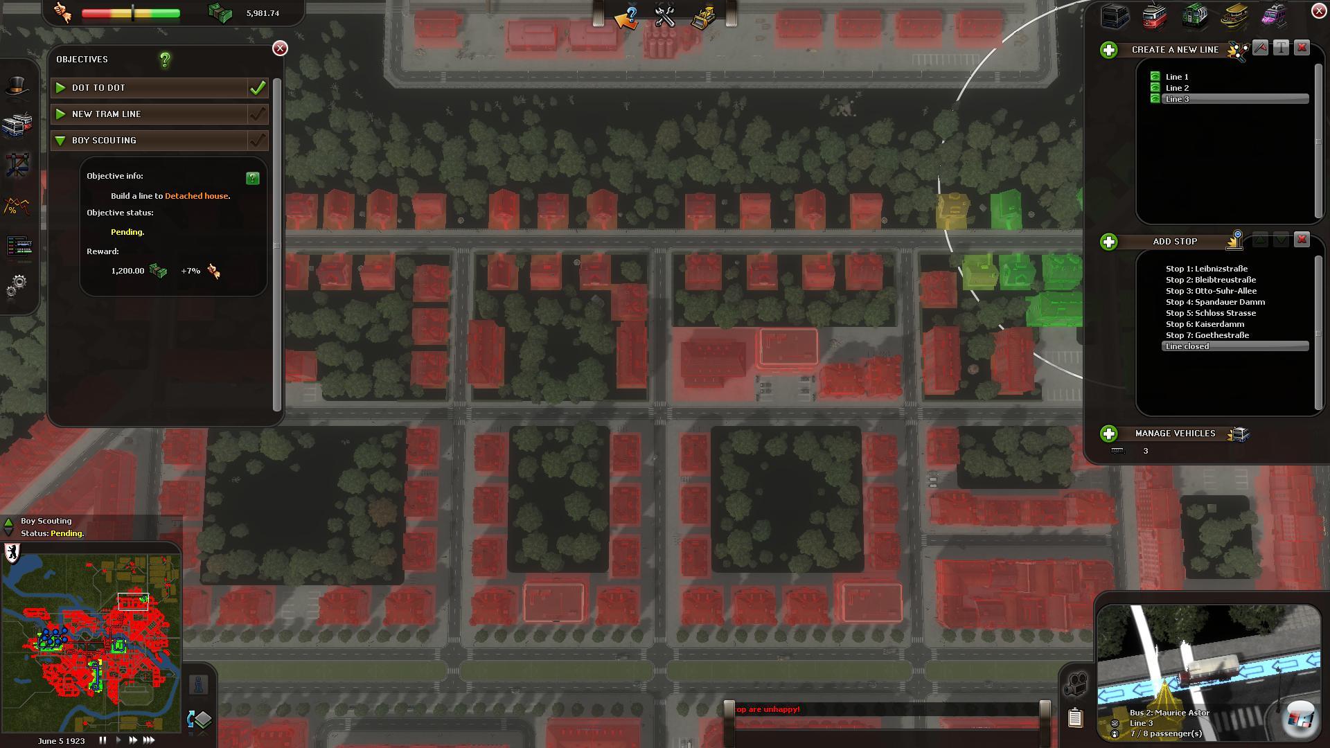denn beim täglichen Betrieb kann so einiges schief laufen. Reichen die Fahrzeuge, sind sie technisch in Ordnung oder braucht man Ersatz? Die ersten Trambahnen im Spiel fassen ganze zehn Leutchen, sind langsam und fallen dauernd aus. Da kann es eng werden, wenn am Brandenburger Tor 60 Fahrgäste mitwollen. Es kann durchaus vorkommen, dass man an die zehn Bahnen kreiseln lassen muss, um alle zu befördern. Zudem muss man diese ganze Armada von Vehikeln inklusive Wartung managen.