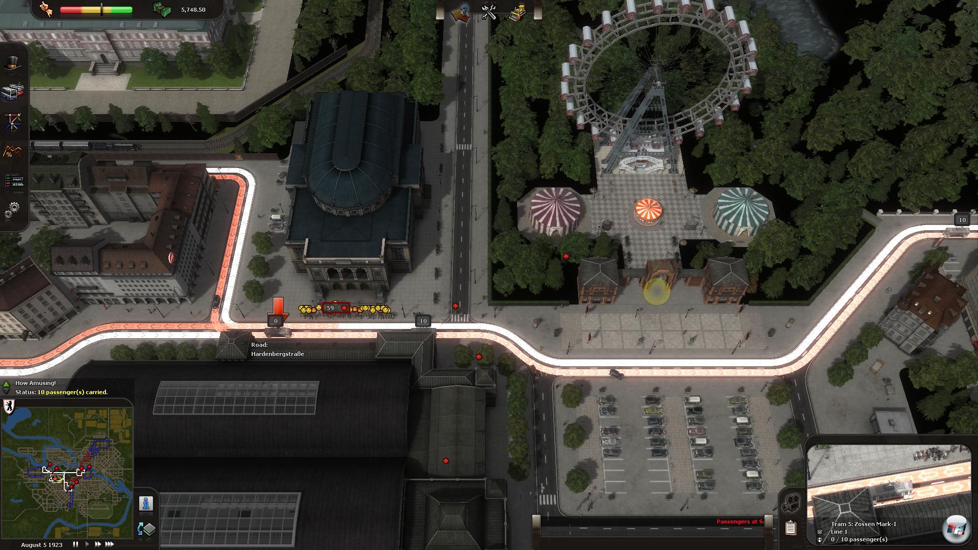 Da hier beim CiM wie gesagt alles etwas allgemein gehalten wurde (Studis und Touristen lassen sich ja noch relativ gut planen) neige ich beim Anlegen von Linien immer schnell dazu (entgegen aller Tipps, möglichst auf Kurzstrecken zu setzen) relativ große 'Rundkurse' zu legen, die die auserwählte Wohn- und Arbeitsgebiete gut durchziehen... was natürlich schnell dazu führt, daß sich meine Fahrzeuge durch diverse Staus quälen müssen.