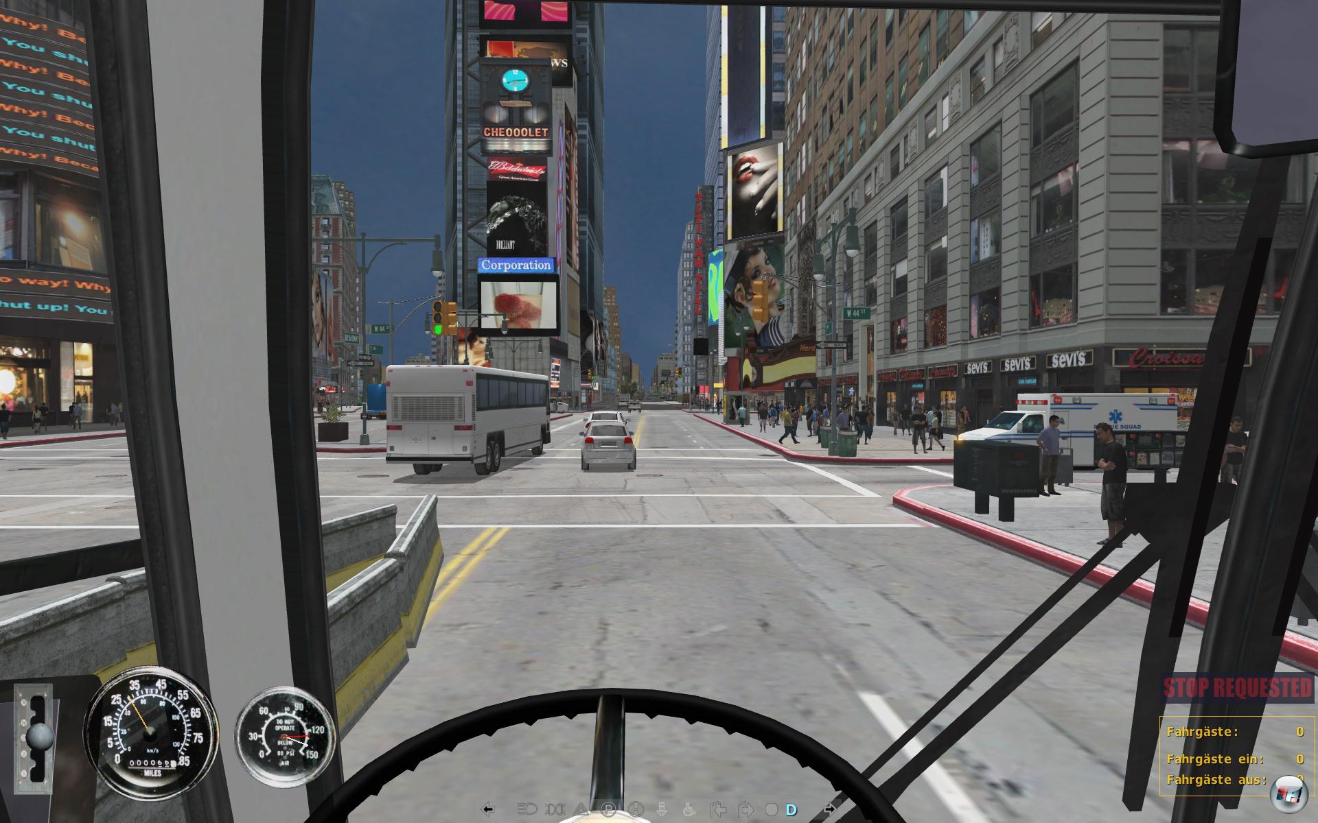 Drei Spielmodi stehen zur Verfügung: Freie Fahrt, Missionen und Kampagne. Eine Kampagne? In einer Alltagssimulation? Das klingt interessant, das schaue ich mir zuerst an. Also stellt man mir Carlos vor, angehender Busfahrer und fortan mein „Alter Ego“. Die Kampagne beginnt mit einem Tutorial, denn das Steuern eines tonnenschweren Busses will geübt werden. Auf einem Trainingsgelände empfängt mich ein untersetzter Typ, der mich in die Bedienung des Nova RTS T80-260 einweist. Blinker, Auf-Abblendlicht, Gangschaltung (wobei der US-Bus über ein Semi-Automatikgetriebe verfügt) Scheibenwischer, Hand- und Haltestellenbremse und vieles mehr wird erklärt. Nach einer Runde um den Platz steht die erste knifflige Aufgabe an: Mein Instrukteur hat es sich in einem Rollstuhl bequem gemacht und möchte gerne per Rollstuhllift an Bord gehievt werden. Dazu fahren wir nah an ihn heran, senken den Bus per „kneeling“ ab und aktivieren von innen den Lift. Dann steigen wir aus, schieben ihn auf die Rampe, fahren von innen den Lift wieder hoch und fertig. Soll mal einer sagen, Busfahrer säßen den ganzen Tag nur auf ihren vier Buchstaben! Abschließend muss noch ein recht anspruchsvoller Parcours absolviert werden und ich bin bereit für die New Yorker Bevölkerung.GTA goes Bussim