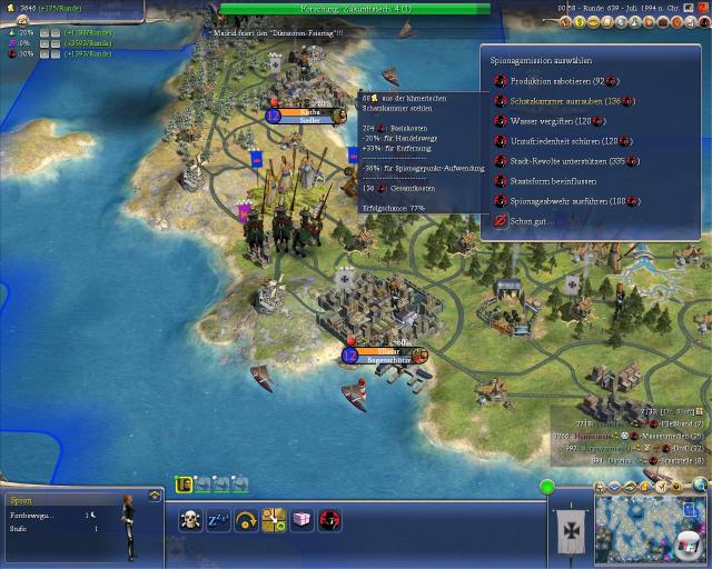 Im Gegensatz zum ersten Add-On „Warlords“ nimmt „Beyond the Sword“ mehr Veränderungen am Ablauf einer normalen Civilization-Partie sowie beim Endlosspiel vor. Stark ausgeweitet gegenüber dem Original aus dem Jahr 2005 wurde die Spionage, die jetzt aus einem eigenen Geldhahn à la Forschung oder Kultur finanziert wird und pro Runde Spionagepunkte generiert. Fortan könnt ihr mit für den Gegner unsichtbaren Spionen – die relativ früh mit der Technologie Alphabet verfügbar sind – hinter die Grenzen ziehen und in Städten entweder die Produktion sabotieren,