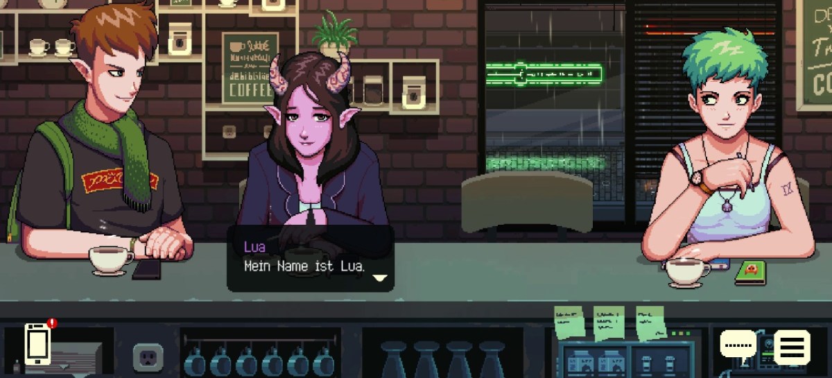 Der Regen prasselt gegen die Scheiben, LoFi-HipHop säuselt aus den Boxen und meine Gäste umklammern ihre dampfenden Kaffeetassen. Coffee Talk ist ohne Frage das gemütlichste Spiel, das ich je gespielt habe. Schon nach wenigen Minuten sorgte das Szenario dafür, dass ich tiefenentspannt den Erzählungen meiner Kunden lauschte, als hätte jemand etwas THC in die Bohnen gemischt. Was ein tolles Kontrastprogramm zum ewigen Looten, Leveln und Kämpfen! Über ein Handy kann man Rezepte der verschiedenen Getränke nachschlagen, Informationen über seine Stammkunden einsehen und Lieder aus der umfangreichen Playlist auswählen. Diese wurde hervorragend von den Entwicklern zusammengestellt, so dass ich das Spiel manchmal nur anwerfe, um die Musik zusammen mit dem Regenschauer zu hören.