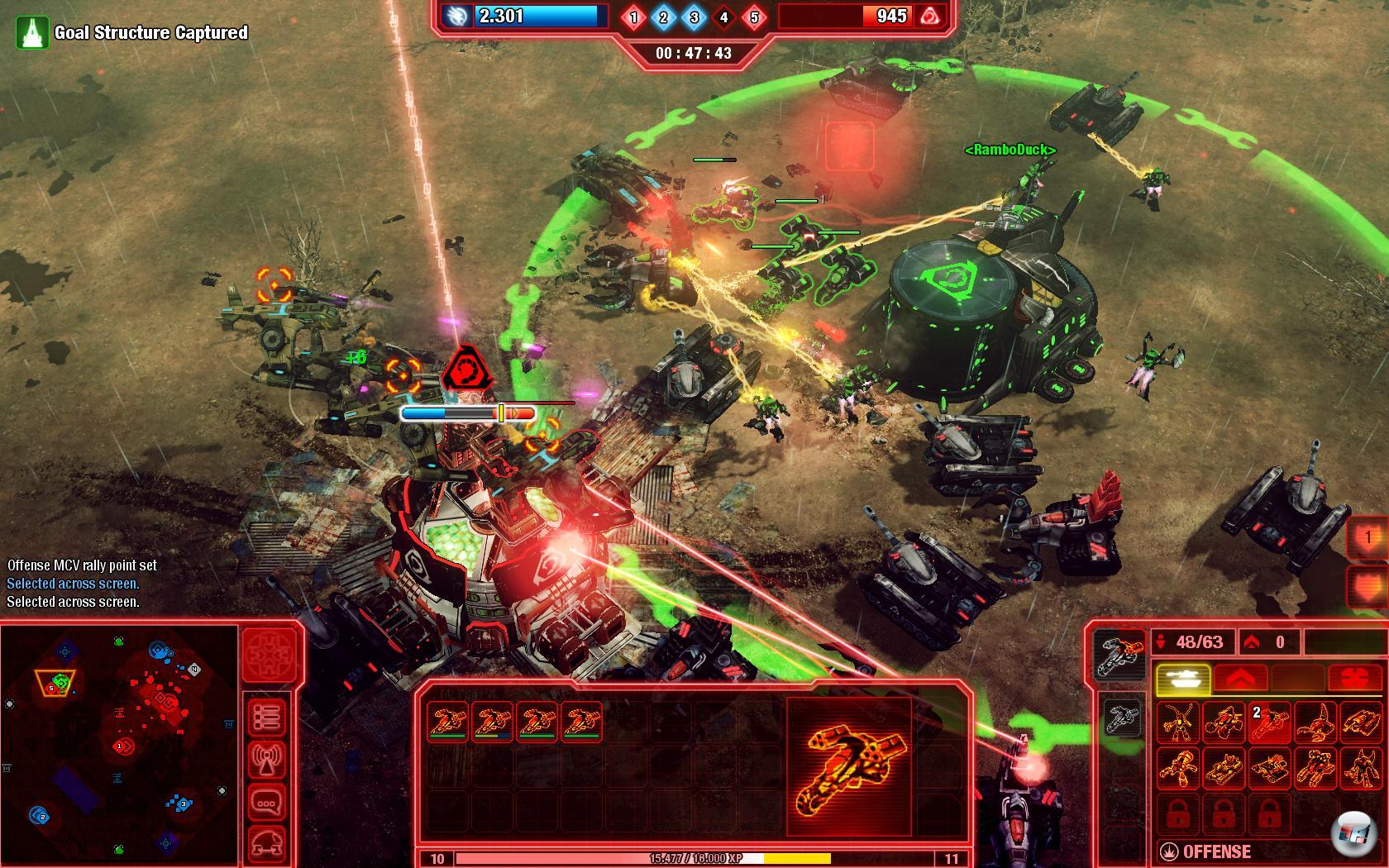Selbst wenn ihr mit 2.000 zu 1.800 im Rückstand liegt (Sieg bei 2.500) könnt ihr die Partie jederzeit drehen und mit vielen schnellen Wuseleinheiten Punkte erobern, wogegen sich die dicken Einheiten schwer tun. Sogar ein Match 3vs3, bei dem ein Spieler während einer Partie rausgegangen ist (zwei Nodler gegen drei GDIler), ließ sich mit einem Rückstand von 2.200 zu 2.100 zu Gunsten von Nod entscheiden, weil die beiden Supporter-Commander ständig die langsamen Mammut/Panzer-Armeen ausgetrickst haben. Verlässt ein Spieler ein Team, bekommen die anderen anteilsmäßig seine Kommandopunkte vermacht.