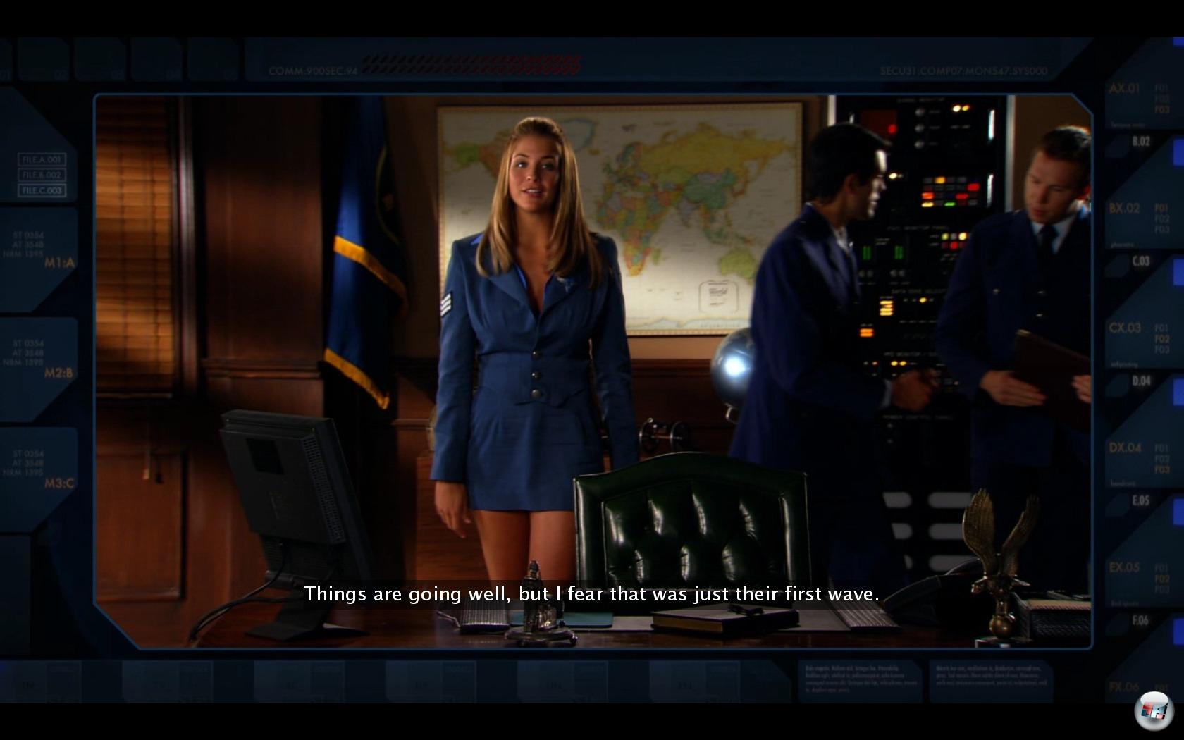 Soviel zu den männlichen Darstellern. Die Schauspielerinnen, die euch primär mit missionsrelevanten Informationen im Briefing versorgen, fallen weniger durch ihr Overacting, sondern durch die bewusst auf die männliche Zielgruppe zugeschnittenen Outfits auf: Tiefer Ausschnitt und dermaßen kurz geschnittene Röcke verführen dazu, nicht der Missionsbeschreibung zu folgen – na ja, zum Glück werden die Auftragsziele später ohnehin wiederholt. Die Zwischensequenzen sind der Hauptmotivationsfaktor der Kampagne und ich hab mich mehrfach ertappt, „nur noch“ eine Mission spielen zu wollen, um zu sehen, wie die Geschichte weitergeht und welche abstrusen Ideen/Sprüche/Lobhudeleien die Charaktere von sich geben. Sogar die Untertitel in den fingierten Nachrichtensendungen sind lesenswert.