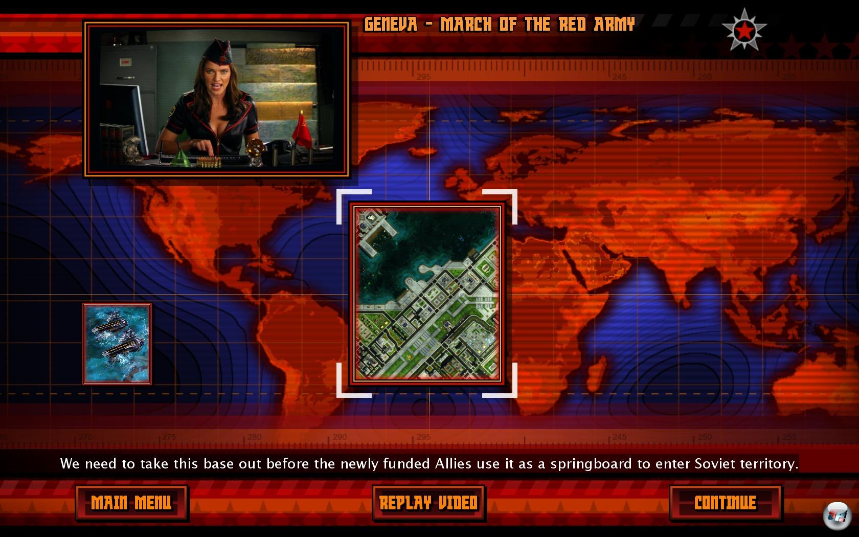 Eure Einheiten gewinnen im Kampf an Erfahrung und ihr als Kommandant sammelt ebenso Punkte, die sich in drei unterschiedliche Reihen von Fähigkeiten investieren lassen – allerdings etwas abgespeckt im Vergleich zu C&C: Generäle. Ihr könnt beispielsweise den „Orbital Drop“ freischalten und verbessern, bei dem die Sowjets Weltraummüll wie Satelliten oder gar Raumstationen auf die Erde schmeißen und mit d