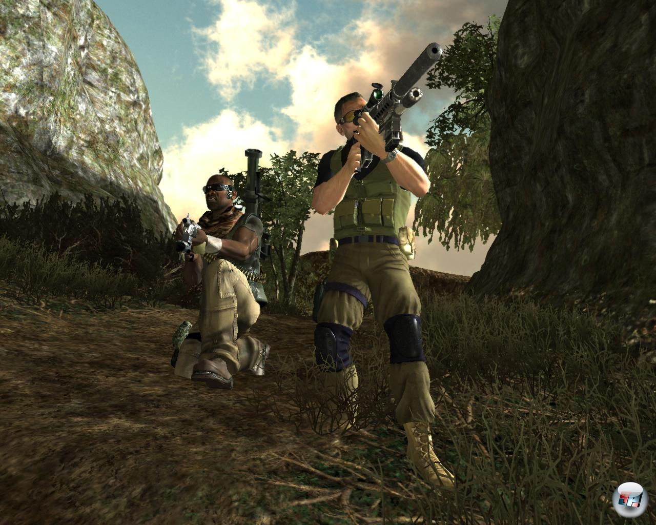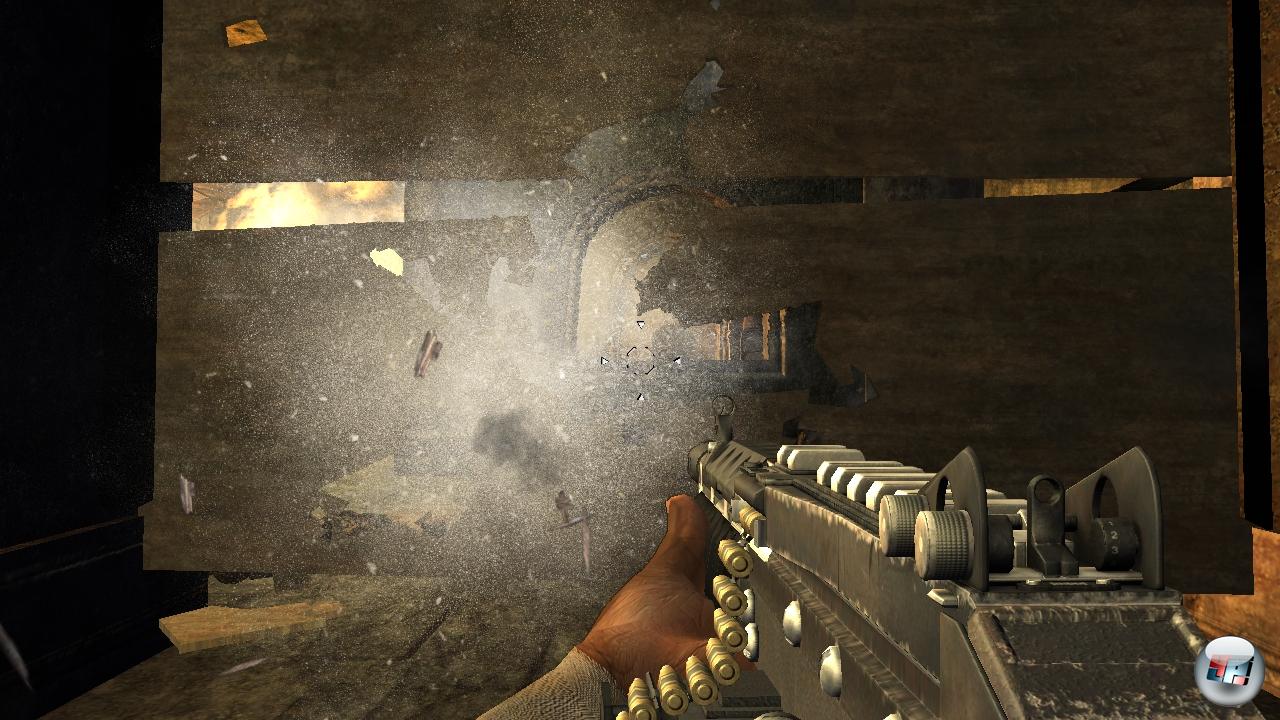 Die Steuerung der beiden Jungs geht einfach von der Hand. Wie schon gesagt wurde das Befehlssystem simpel umgesetzt und auch Aktionen wie Schießen, Waffenwechsel, Nachladen und Zoomen funktioniert ohne Probleme. Etwas fummelig erweist sich lediglich das Steuern von Fahrzeugen wie Panzer oder Hovercraft, die sehr schwammig reagieren. Zum Glück seid ihr aber nur selten in Vehikeln unterwegs. Ein echtes Deckungssystem, mit dem ihr euch an die Wand lehnt, gibt es hier nicht. Ihr habt lediglich die Möglichkeit, schräg um Ecken zu blinzeln und auch aus dieser Position heraus zu feuern. Dafür fungiert die Gewehrkamera quasi als Deckungssystem, da ihr mit ihr sicher um Ecken oder Mauern spähen und sogar angreifen könnt. Allerdings gibt es gerade mit dem Snipergewehr öfters Probleme mit der Kollisionsabfrage: Auch wenn ihr den Kopf eures Gegners genau im Visier habt, gehen Schüsse manchmal aus bestimmten Positionen heraus ins Leere und ihr müsst euch einen anderen Platz zum Abdrücken suchen, auch wenn sich eigentlich schon vorher nichts im Weg der Schussbahn befunden hat. Deckungen bieten jedoch nicht nur Schutz, sondern können auch taktisch eingesetzt werden, indem ihr mit dem Gewehr zuerst in kleines Loch durch Holzbarrieren schießt, so dass gerade der Lauf durchpasst, um anschließend die Gegner aus einer verdeckten Position heraus anzugreifen. Klingt in der Theorie toll, doch in der Praxis werdet ihr nur selten von dieser Möglichkeit Gebrauch machen. Meist geht es in den Gefechten richtig zur Sache und ihr seid von Gegnern umzingelt. Gerade bei einer solchen Übermacht an Feinden habt ihr als PS3- oder 360-Besitzer ein kleines Problem: In den Optionen lässt sich die Empfindlichkeit der Analogsticks nirgends einstellen und ihr müsst mit einer Standardvorgabe leben. Zwar funktioniert das Umschauen nach rechts und links gerade noch flott genug, doch sobald ihr nach oben oder unten schauen wollt, geht es einfach zu träge vonstatten. Da haben es PC-Spieler schon besser, die mit Maus und Tastatur ausgestattet die Sensibilität nach den eigenen Wünschen anpassen können. Es sei denn, sie spielen mit dem 360-Controller, der ebenfalls vom Programm unterstützt wird, denn dann teilen PCler das gleiche Schicksal wie die Konsoleros. Neben der anpassbaren und flotteren Steuerung hat die PC-Version allerdings noch einen großen Vorteil: Ladezeiten sind praktisch nicht vorhanden, während Konsolenspieler eine ganze Zeit lang warten müssen, bis die Missionen in den Speicher geschaufelt sind.