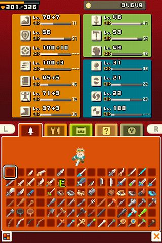 Danach ist langweiliges Aufleveln angesagt, indem ihr euch einige Minuten durch Monster kloppt. Ausgeschaltete Feinde hinterlassen außerdem allerlei Goodies und Münzen, die ihr wiederum in Läden gegen hilfreiche Items eintauscht. Dazu gehören Waffen wie unterschiedliche Schwerter, Schlagstöcke und Zauberstäbe und ein Dietrich zum knacken von Schlössern. Euren Energievorrat könnt ihr mit diversen Lebensmitteln auffüllen. Aber nur zu einem gewissen Grad, denn irgendwann ist Terrys Magen voll. Jede Mahlzeit hat eine eigene Verdauungszeit, nach welcher der Magen wieder aufnahmefähig ist. Manche Zutaten wie rohes Fleisch könnt ihr nicht sofort verputzen, sondern müsst sie zuvor an Kochstellen in fertige Gerichte verwandeln. Allerdings erst, wenn ihr die Kochschürze besitzt. Sie ist eine der Verkleidungen, die euch spezielle Fähigkeiten verleihen. Ein weiteres Extra sind die Aufkleber, die der Professor für euch entwickelt. Ihr verwandelt z.B. alle sichtbaren Gegner in eine andere Spezies, indem ihr ein magisches Etikett auf den Screen pappt.