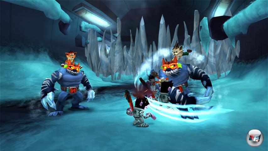 Habt ihr genug vom Solo-Dasein, kann ein Freund auf Knopfdruck jederzeit ein- und aussteigen, woraufhin ein grauer Crash-Klon beim Abenteuer hilft. Jedenfalls auf allen Plattformen außer der PSP, hier fehlt dieser Modus komplett – stattdessen gibt’s fünf langweilige Minigames, für die jeder der vier Mitspieler eine eigene UMD benötigt! Bei den anderen Varianten ist das gerade bei größeren Gefechten eine prima Sache, allerdings gibt es keine Möglichkeit das »Friendly Fire« abzustellen – also Obacht beim wilden Draufloskloppen! Im Spielmodus »Huckepack« kann der zweite Spieler jederzeit in den Rucksack des ersten springen, dadurch gibt’s bei längeren Sprungpassagen keine Probleme, denn die Kamera bleibt immer auf Nummer Eins zentriert, einen Splitscreen-Modus gibt es nicht. Die zweite Spielvariante heißt »Bockspringen« und unterscheidet sich von der anderen lediglich dadurch, dass beide Spieler, sofern sich einer im Rucksack befindet, nach jedem Sprung die Plätze tauschen – klingt verwirrend, spielt sich auch so.