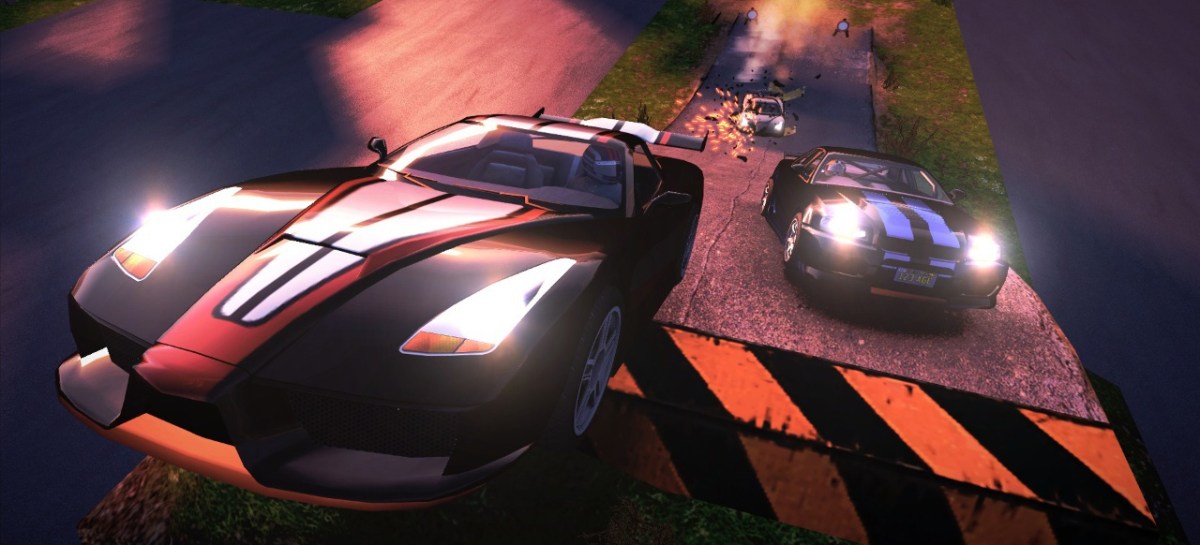 Der rockige Ansatz aus dem Hauptmenü wird im Spiel konsequent weitergeführt, der Soundtrack besteht aus einer guten Mischung aus harten und chilligen Klängen sowie gut treibenden Beats. Im Vergleich dazu schwächeln die Soundeffekte, besonders die Motorengeräusche jaulen belanglos vor sich her. Die optik sammelt da schon mehr Pluspunkte, speziell die Automodelle sind extrem gut gelungen: schnittig, sauber animiert und cool designt versprühen die von echten Wagen inspirierten Karren jede Menge Rasanz. Und gehen herrlich zu Bruch, denn das Schadensmodell mit seinen Massen herumfliegender Wrackteile, zerberstenden Scheiben, absprengenden Wagenteilen und richtig fetten Explosionen, die ein sehr befriedigendes KRAWATZ!-Gefühl vermitteln, ist spitze. Um den Schrott-Gaffer endgültig zufrieden zu stellen lässt Entwickler Moonbyte im Pause-Modus die Kamera um den eingefrorenen Wagen rotieren – prima für Screenshots, noch besser für spektakuläre Ansichten explodierender Dinge.
