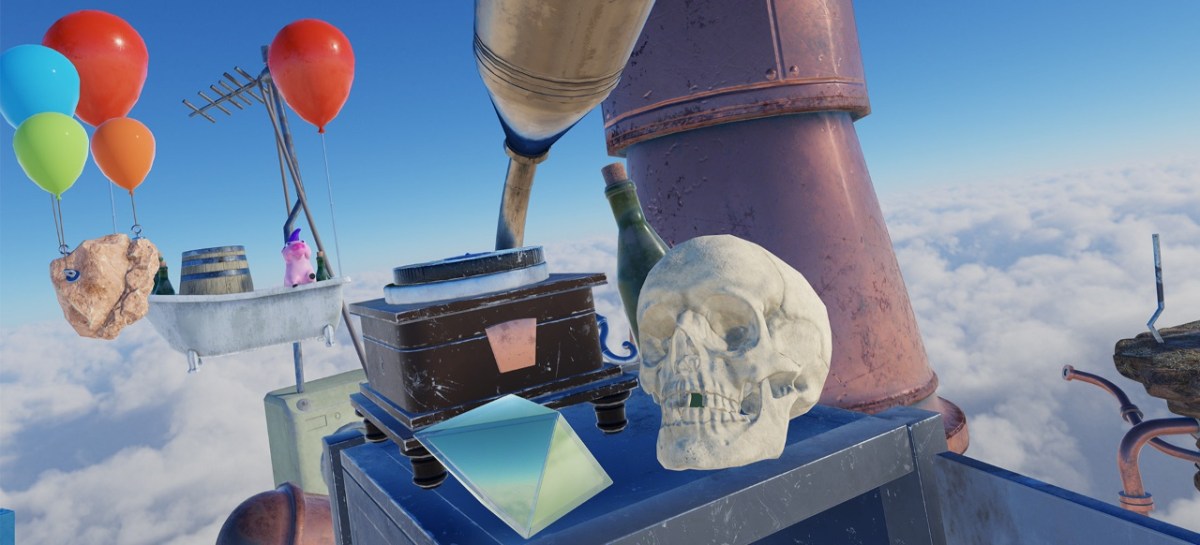 Auch an eine kleine Rahmenhandlung haben die Entwickler diesmal gedacht: Erstmals schlüpft man selbst in die Rolle des verrückten Professors, der bei den bizarren Experimenten meist versucht, wieder an seine rosa „Clumsy“-Einhörner zu gelangen. Ich habe allerdings nicht auf Anhieb verstanden, wer dort eigentlich aus dem Off zu mir spricht. Vielleicht hätte man zu Beginn eine kurze Einleitung einbauen sollen, die erklärt, dass man eigentlich nur den Gedanken der eigenen Spielfigur lauscht – die übrigens auf Deutsch vertont sind. Wünschenswert wäre auch ein Optionsmenü gewesen. Die Level-Übersicht und einige Sandbox-Stages zum freien Herumspielen werden zwar hübsch in einem Hausflur präsentiert – zumindest auf unserem schwächeren VR-Rechner hätte ich aber gerne einige Grafik-Feinheiten heruntergeregelt. Mit einer GeForce GTX 970 lag die Framerate manchmal schon leicht unter einem angenehmen Level – vor allem, wenn wir mit der Oculus Rift spielten. Mit der Vive blieb die Performance des Steam-VR-Titels ein wenig flüssiger. Eine optionale Umbelegung des Griffknopfes für mehr Bequemlichkeit wäre ebenfalls nett gewesen. Zudem gibt es leider keinen Level-Editor mit Tausch per Steam-Workshop wie in Teil 3 oder in Fantastic Contraption.