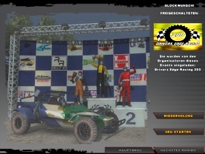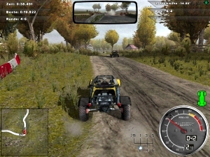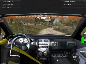 den Titel »Schönste Schlammfahrt-Simulation« abgeben – CRC 2005 sieht super aus! Fein modellierte Wagen mit schönen Details wie modellierten Heizdrähten auf dem Heckfenster, Echtzeit-Umgebungsspiegelungen und schick glänzendem Lack rasen durch dicht bewachsene Hügel und Wälder, wirbeln mächtig Staub, Dreck oder Schnee auf und werfen realistische Schatten – besonders schön anzusehen aus der schwierig zu fahrenden Cockpitperspektive. Dazu gibt es schöne Effektspielereien wie Bewegungsunschärfe, einen optionalen Rauschfilter, der die Grafik etwas »dreckiger« macht, beachtliche Fernsicht – und erstaunlich kurze Ladezeiten! Allerdings geht die höchste Detailstufe ordentlich auf Kosten der Hardware, außerdem gehört auch CRC 2005 zu den Spielen, bei denen der Streckenrand mit Figuren aus dem Papp-Museum besetzt ist. Die Siegerehrung, die ihr am Ende jedes Rennens zu sehen bekommt, gehört ebenfalls zu den optischen Lowlights: derartige Holzfäller-Animationen haben in einem sonst so durchgestylten Programm eigentlich nichts verloren!