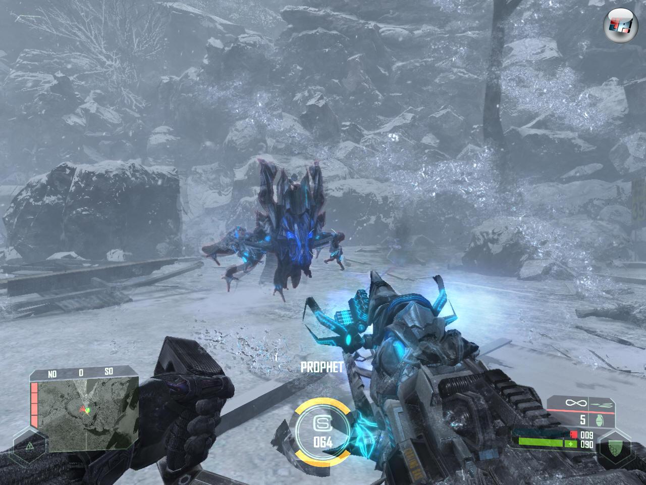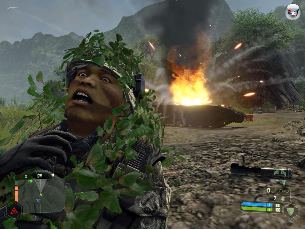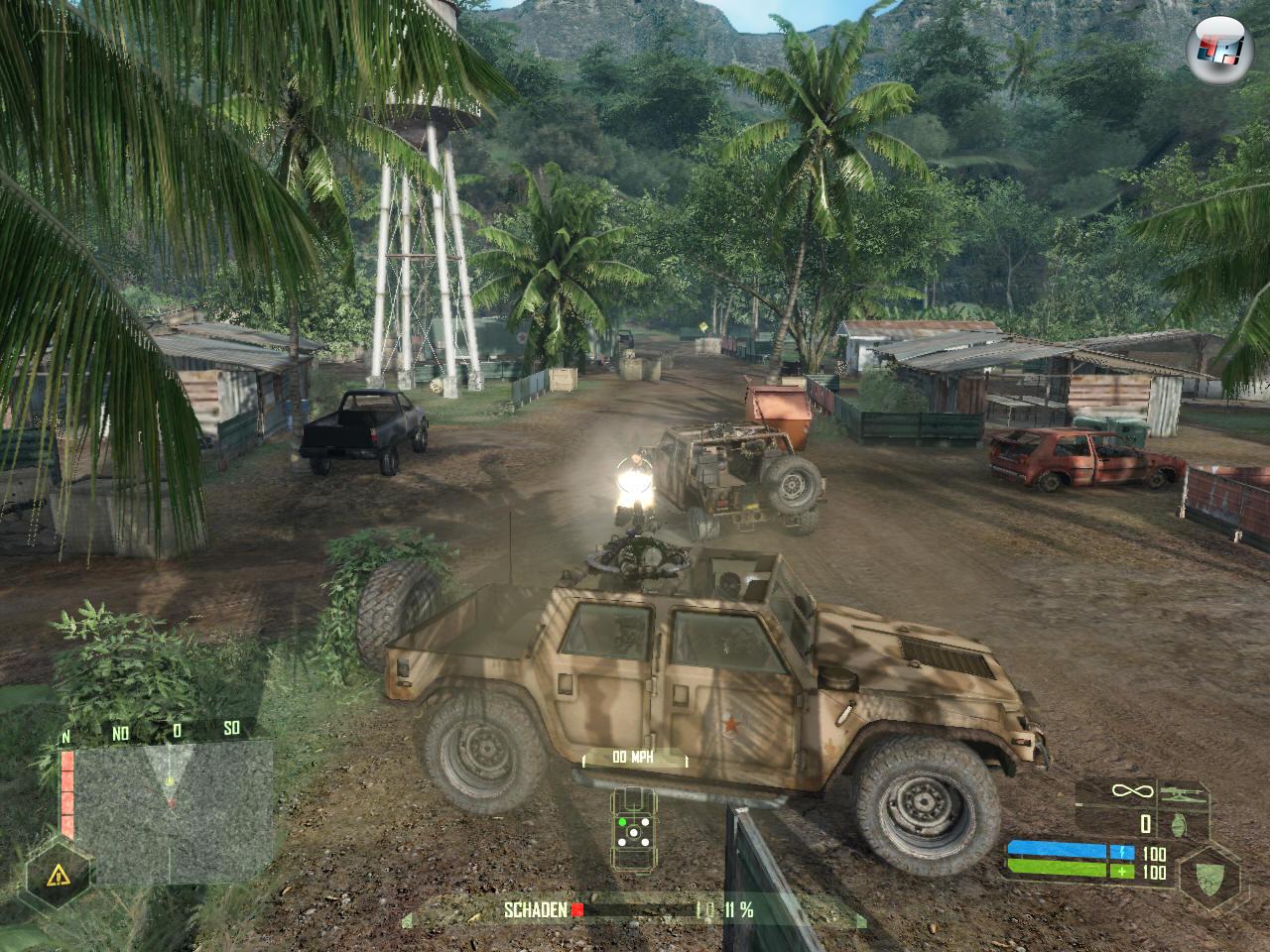 Diese Tools können über Erfolg oder Scheitern entscheiden, denn Crysis ist schon auf dem zweiten der vier Schwierigkeitsgrade eine Herausforderung: Die Gegner haben Luchsaugen, ein ruhiges Händchen und einen schnellen Abzugsfinger – und sie schlucken, im Gegensatz zum Protagonisten, absurd viele Treffer! Davon abgesehen kann sich die KI wie schon bei Far Cry sehen lassen: Feinde reagieren auf Lichtstrahlen, nutzen geschickt Deckung, agieren als ausschwärmendes Team und weichen Beschuss aus. Gelegentlich spinnt das System aber: Da läuft mal ein Feind an mir vorbei, ein anderer bleibt zappelnd an einer Stelle stehen und ein dritter zielt zwar auf mich, überlegt es sich dann aber doch anders – und macht einfach gar nix. Das dürfte auf der höchsten Schwierigkeitsstufe für Erleichterung sorgen, denn hier wird aus dem Actiongame ein Taktikspiel, in dem man sich jeden Meter erkämpfen muss – ohne Fadenkreuz, ohne Granatenwarnung und aus irgendeinem Grund ausschließlich Koreanisch statt Deutsch redenden Widersachern. Falls ihr im späteren Spielverlauf die anfängliche Wahl des Schwierigkeitsgrades bereut, kommt euch das Game netterweise entgegen: Ihr dürft ihn auch im Nachhinein jederzeit ändern.