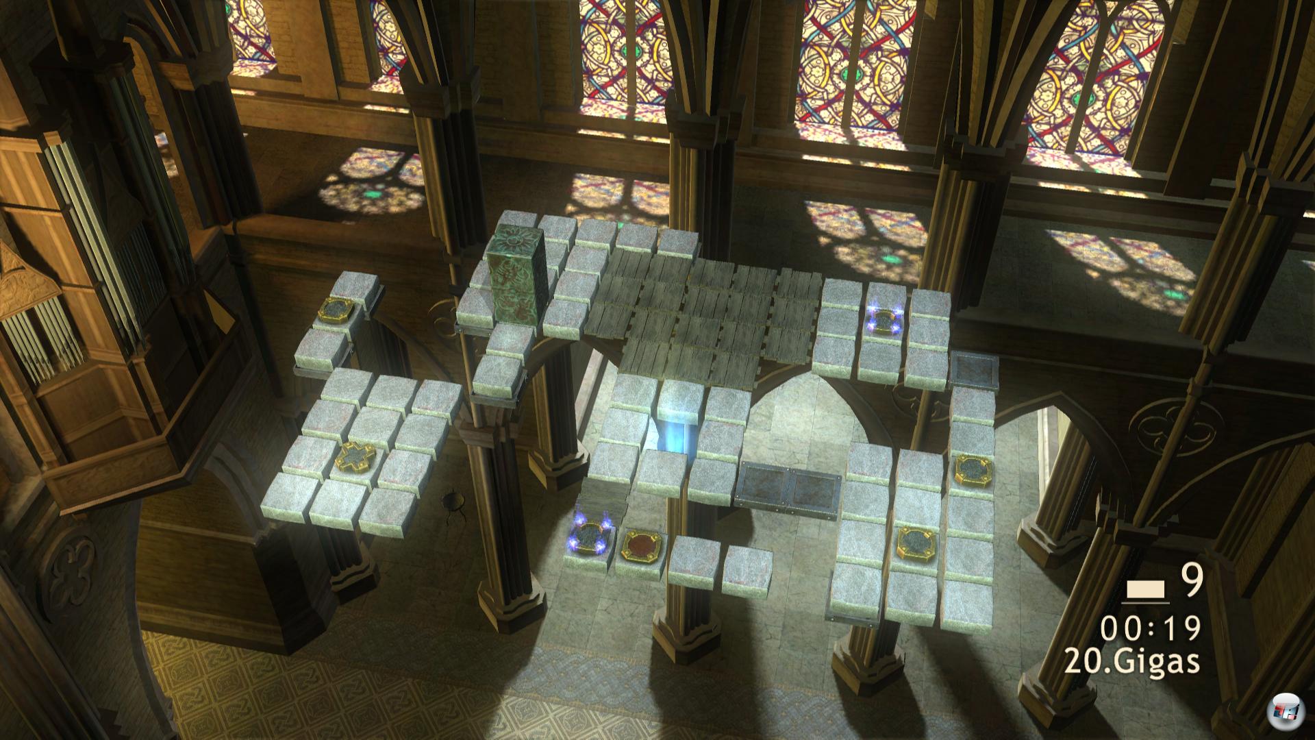 Irgendwo brennen Feuer in Schalen, Mosaike zieren den riesigen Boden, schlanke Backsteinsäulen werfen Schatten und durch Buntglasfenster dringt Licht – man fühlt sich fast wie in einer mittelalterlichen Kathedrale. Aber das, was noch eindringlicher als die edle, aber statische 1080p-Kulisse ins Auge fällt, schwebt direkt in der Luft: Ein Spielbrett aus vielen quadratischen Marmorsteinen, in dessen Mitte ein Loch mit blauem Glühen lockt. Genau diese Stelle gilt es zu erreichen, um einen Level zu meistern – am besten mit so wenig Zügen wie möglich.![]()