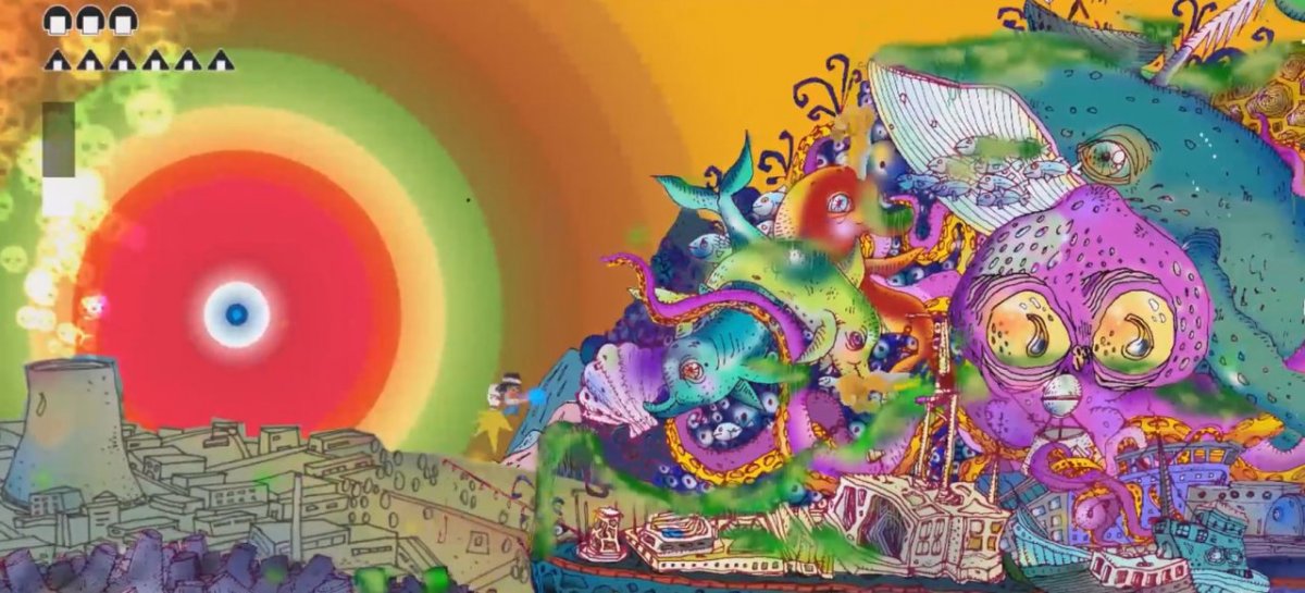 Dass sich Daiichi Dash schon eine ganze Weile in Arbeit befand, bemerkt man u.a. daran, dass die Story zum Start der Entwicklung noch ein brenzliges Thema war. Darf man die japanische Tsunami- und Atomkatastrophe schon so früh als Ausgangspunkt für ein Unterhaltungsprodukt benutzen? Nachdem das Spiel des kleinen Berliner Studios KKM eine Weile in der Versenkung verschwand, weil die Entwickler anderweitig ihre Bötchen verdienen mussten und nur noch nebenbei Zeit für ihr Herzensprojekt hatten, legt der Release nun eine Punktlandung inmitten einer pandemischen Katastrophe hin. Ziemlich verrückt irgendwie, gab auch Entwickler Christoph Mille zu, als er uns den Review-Key zusandte. Noch bizarrer ist natürlich die Farbgebung der Kulissen, die einen regelrecht anspringt. Und natürlich all das, was darin grotesk animiert herumwuselt: Insektoide Kuhmutanten, wild wimmernde Fuchsrümpfe, rotierende Untergrund-Nacktmulle und atomar glühender Möwenschiss sind nur einige der angenehm exzentrischen Warnungen vor der mehr oder weniger friedlichen Nutzung der Kernenergie.
