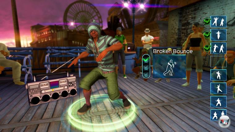 In der Theorie klingt dies sehr nach Just Dance. Doch Harmonix gibt einem keine Chance, sich auf pure Arm-Bewegungen zurückfallen lassen zu können – immerhin steht hier ein Ganzkörper-Sensor zur Verfügung. Und der wird vorbildlich genutzt. Zumal Harmonix den weisen Entschluss gefasst hat, dass sich die Bewegung vor dem Schirm nur auf die Punktzahl und nicht auf die Bewegung des klasse animierten Tänzers im Spiel auswirkt. Es gibt keinen Avatar, der sich zu den Rhythmen aus mehreren Jahrzehnten Dancefloor-Geschichten verbiegen müsste. Und damit gibt es auch keine offensichtlichen Latenzprobleme. Oder ganz lapidar: Wie bei handelsüblichen Rhythmus-Spielen kommt es nur darauf an, im richtigen Moment die richtige Taste zu drücken – in diesem Fall, mit dem richtigen Arm, der Hand, dem Bein oder der Hüfte an der richtigen Stelle zu sein, damit die Kamera die Bewegungs-Pose erfassen kann. Wie bei keinem anderen Starttitel wird das Kinect-Mantra „Du bist der Controller“ so konsequent und erfolgreich in ein klassisches Spieldesign gepresst wie hier.