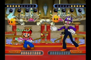 Am Ende jeder Welt wartet der obligatorische Bossgegner – nur dass er hier nicht mit Feuerbällen, sondern mit geschnürten Tanzschuhen auftritt! Wie wäre es also mit einem Berserker-Boogie gegen Waluigi, einem Riesenrad-Duell gegen Wario oder einem heißen Breakdance gegen Bowser persönlich? Diese Duelle sind auch die eigentlichen Herausforderungen des Spiels, denn der Schwierigkeitsgrad ist generell niedrig angesetzt. Erst auf der höchsten der fünf Stufen (wobei anfangs nur zwei niedrige anwählbar sind) bekommen Dancing Stage-Profis eine Herausforderung – im einfachen Bereich werden nicht alle Richtungen ausgenutzt, es gibt kaum Zwischentakte. Dieses Spiel ist klar auf Tanzanfänger und jüngere Spieler ausgerichtet, wofür auch die bekloppten, aber doch irgendwie kindischen Gags zeugen: das Korkenzieher-Hotel, die tanzenden Teller in der Eishütte oder Wario, der von den Vorteilen seines neuen Spiels »Dancing Stage: Wario Mix« schwadroniert.