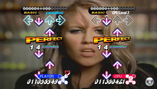 Dabei fängt alles so harmlos an: Im Basic Mode werdet ihr in vielen Tutorials langsam an das Spielprinzip heran geführt, das eigentlich noch das gleiche ist wie vor einigen Jahren und sich am einfachsten mit Guitar Hero vergleichen lässt. Im Gegensatz zu Activisions rockigem Musikspiel scrollen die Symbole allerdings von unten nach oben und ihr müsst im richtigen Moment und mit Taktgefühl die entsprechende Stelle auf der Tanzmatte berühren, wobei auch Kombinationen möglich sein und manche Noten länger gehalten werden müssen… Fühlt ihr euch nach den Einführungsschritten fit genug, geht es weiter zur Master Edition, wo sich die vielfältigen Spielmodi von Dancing Stage Universe offenbaren. Für ein kleines Tänzchen zwischendurch eignet sich der Game Mode, in dem ihr einfach zu einem der über 40 enthaltenen Songs im Schwierigkeitsgrad eurer Wahl loszappelt. Darunter befinden sich bekannte Titel wie Rock Steady von den All Saints, Girls von The Prodigy oder Hate To Say I Told You von The Hives inklusive den Originalvideos. Die meisten Tracks sind jedoch zum Teil recht wüste und unbekannte Techno- und Dance-Remixe, bei denen z.B. auch Musikthemen aus Castlevania verwurstet werden. Einige davon klingen ganz okay, doch bei den meisten Songs verspürte ich keine große Lust, mich zur gewöhnungsbedürftigen Musik zu bewegen. Es gibt gerade in Europa so viele klasse Dance-Titel – warum hat sich Konami nicht etwas mehr am musikalischen Angebot hiesiger Gefilde bedient? Zudem haben einige der bekannteren Hits mittlerweile auch schon ein paar Jahre auf dem Buckel, so dass die Zusammenstellung nicht unbedingt up-to-date ist. Hinzu kommt, dass die Musikvideos bei den unbekannten Songs durch psychedelische Farbspiele und tanzende Anime-Mädels ersetzt werden, die teilweise zu stark vom Geschehen ablenken, so dass man schon mal in dem ganzen Farbrausch den Überblick verliert. Und wer zu oft daneben hüpft, für den ist der Tanzspaß ganz schnell vorbei und ein neuer Versuch muss gestartet werden. Da hilft dann auch das Anfeuern der Anime-Girls nicht mehr, die übrigens nur Englisch sprechen. Die Bildschirmtexte wurden dagegen lokalisiert.