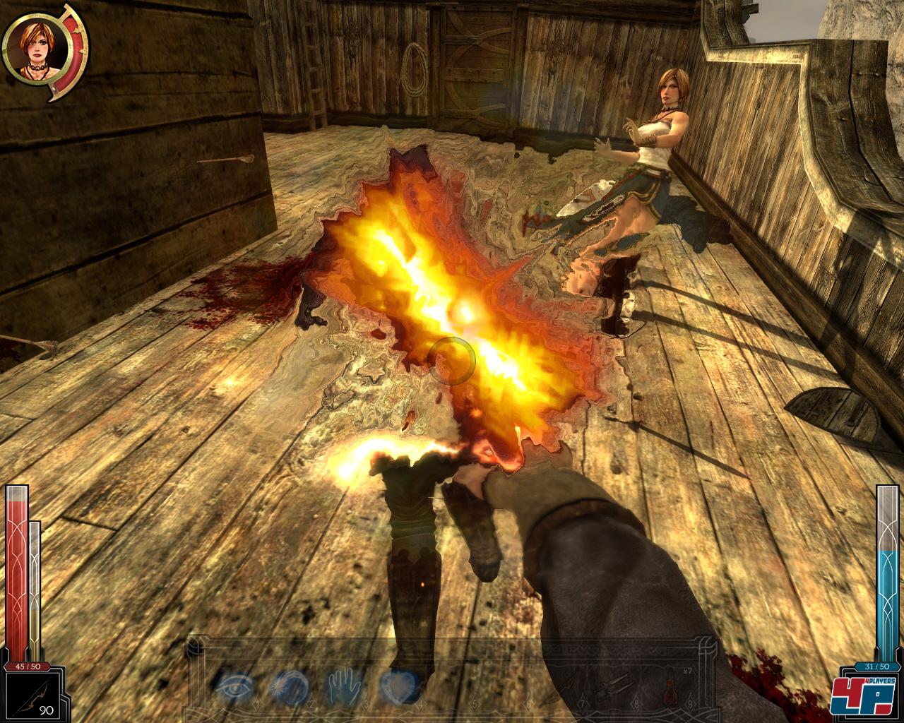 Dark Messiah of Might & Magic ist kein Rollenspiel – ebenso könnte man Jedi Academy <a class="DYNLINK" onmouseover="DynToolTipp_Show('Klicken für Gameinfos‚)“ onmouseout=“DynToolTipp_Hide(); “ href=“javascript:DynCont_Display(‚Gamefinder‘,’runmod.php?sid=%7BSID%7D&LAYOUT=dyncont_gf&spielid=3864′)“> als Rollenspiel bezeichnen. Es ist ein Actiongame mit leichtem RPG-Einschlag, ein Hack-n-Slay light, und light auch nur, weil ihr es mit weniger Gegnern als z.B. in Baldur’s Gate: Dark Alliance 2 <a class="DYNLINK" onmouseover="DynToolTipp_Show('Klicken für Gameinfos‚)“ onmouseout=“DynToolTipp_Hide(); “ href=“javascript:DynCont_Display(‚Gamefinder‘,’runmod.php?sid=%7BSID%7D&LAYOUT=dyncont_gf&spielid=3838′)“> zu tun bekommt. Das Spielprinzip ist aber dasselbe: Ihr habt eine Waffe in der Hand (Schwert, Bogen, Feuerzauber etc.), ein paar Gegner vor euch – und der Rest dürfte klar sein. Das Kampfsystem ist sehr simpel: Dauerklicken mit der linken Maustaste löst schnelle, aber recht schwache Schwerthiebe aus, Gedrückthalten und Loslassen bewirkt einen wesentlich mächtigeren Schlag. Das rechte Mausohr dient dem Blocken, außerdem dürft ihr noch in Verbindung mit einigen Tasten Kombos schlagen. Viel nützlicher ist allerdings die F-Taste: Damit könnt ihr Gegner und Dinge beliebig in der Gegend herumkicken! Die Physikengine, die sich schon in Half-Life 2 <a class="DYNLINK" onmouseover="DynToolTipp_Show('Klicken für Gameinfos‚)“ onmouseout=“DynToolTipp_Hide(); “ href=“javascript:DynCont_Display(‚Gamefinder‘,’runmod.php?sid=%7BSID%7D&LAYOUT=dyncont_gf&spielid=1172′)“> um realistisch schliddernde Kisten und zappelnde Gegner kümmerte, kommt auch hier zum Einsatz. Das sorgt für eine sehr interessante Spielerfahrung: Lümmelt sich ein Ork an der Kante eines angemessen hohen Kliffs, reicht ein gut platzierter Tritt, um ihm das Fliegen beizubringen. Ein stacheliges Gitter + ein davor die Zähne fletschender Feind = ein Problem weniger. Verpasst ihr einem Widersacher einen Arschtritt in Richtung eines brutzelnden Feuers, läuft er wenige Sekunden später als schreiende