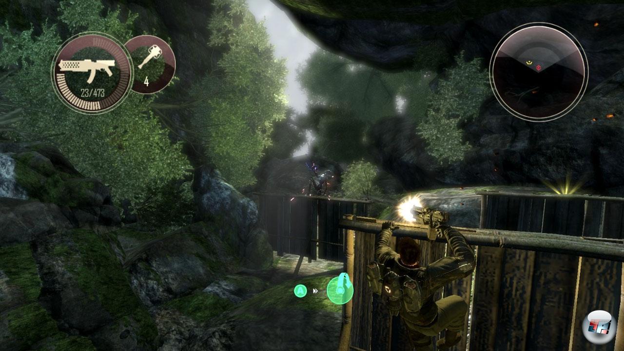 Wenn ich weite Canyons überfliege oder mich durch gigantische mechanische Anlagen kämpfe, kann ich dem Inneren des Bermudadreiecks sogar verzeihen, dass seine Oberflächen kantiger und detailärmer wirken als anderswo. Vielleicht ist deshalb sogar die Tatsache verschmerzbar, dass sich die Anzahl der als mögliche Deckung definierten Objekte in überschaubaren Grenzen hält und manche unsichtbare Wand unnötig früh den Weg versperrt. Sauer stößt mir dafür die fehlende Abwechslung auf: Es gibt den Dschungel, in dem Will zunächst laufen und schweben lernt, es gibt die metallene Inneneinrichtung der außerirdischen Gebäude und es gibt den erwähnten Canyon – Braun in Braun, mit seinen kantigen Bergen durchaus exotisch, aber letztlich zu eintönig. Nicht zuletzt gaukelt mir die Außenwelt eine Offenheit vor, die es dank unsichtbarer Grenzen gar nicht gibt. Wer zu den Wasserfällen am Horizont fliegen will, sieht leider schnell dabei zu, wie Will mit einer Rückwärtsrolle kehrtmacht.