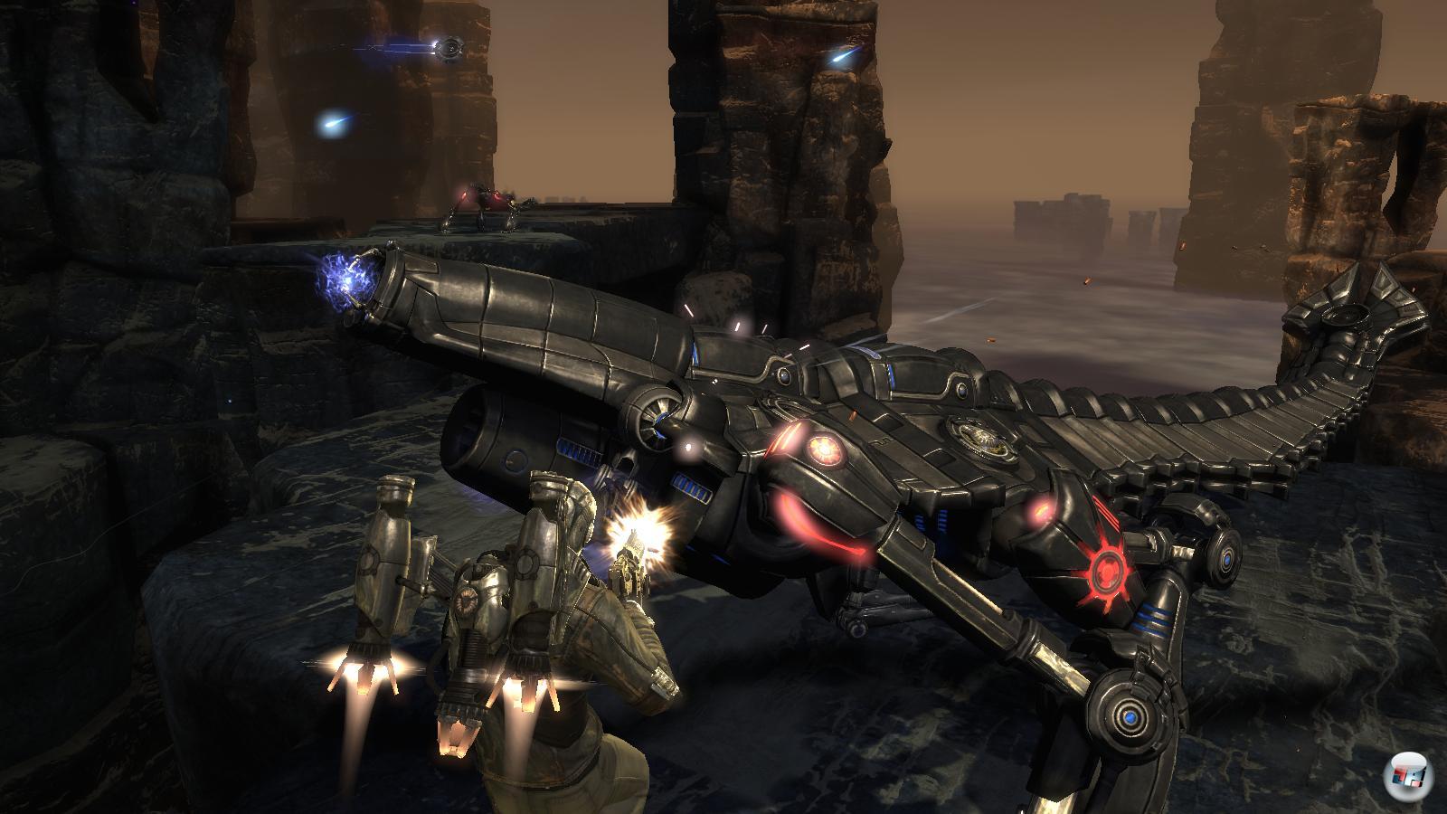 Fliegen, aha. Will trägt ja ein Jetpack, also einen raktengetriebenen Antrieb auf dem Rücken, mit dem er über weite Abgründe schweben oder hohe Felsen erreichen kann. In großen Räumen pendelt er damit also gemütlich von einer Wand an die nächste? Kann er dabei denn wenigstens schon schießen? Klar kann er! Aber das ist wahrlich keine Kunst. Allerdings hebt er sich das gemütliche Schweben für das „Umgehen“ einer feindlichen Position oder die gelegentliche Flucht in luftige Höhen auf. Denn für weite Entfernungen schaltet Will von „Schweben“ auf „Vollgas“ – ein Knopfdruck und schon drückt es ihn mit gewaltiger Wucht in Richtung Fadenkreuz. Plötzlich sind es nur noch zwei Sekunden bis zum anderen Ende des Raums; bremst Will zu spät, versenkt er seinen Schädel mit lebensbedrohlichen Folgen in einer Mauer. Und nein, da liegen nicht nur zehn, zwanzig Meter zwischen Start und Landung. Das sind die gesamten mehreren hundert Meter, die der Held in einem Wimpernschlag überwindet! Dark Void hat mir deshalb ein ganz neues Gefühl für die Tiefe, Breite und Höhe eines Raums gegeben.