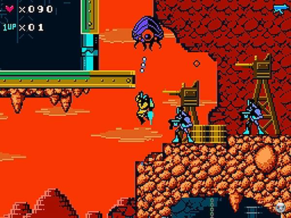 Neben dem Jetpack gibt es noch weitere Upgrades: Neue Waffen wie Raketenwerfer oder Desintegrator, eine erhöhte Feuerrate oder -oooch, schon lange nicht mehr gesehen- Lebensenergie-Herzchen. Man kann immer nur eine Waffe mit sich führen, vor wichtigen Stellen bekommt man die passende Wumme aber auf jeden Fall aufgedrückt – wichtige Stellen wie z.B. Räume, in denen Bosskämpfe stattfinden. Technisch sollte man DVZ gehobenen NES-Standard erwarten, Megaman 9 und 10 liefern da ganz gute Anhaltspunkte. Und genau wie bei den beiden ist vor allem der Soundtrack erwähnenswert: Das wunderbar fiepsige Dedudel geht dem Retro-Freund direkt ins Bein.