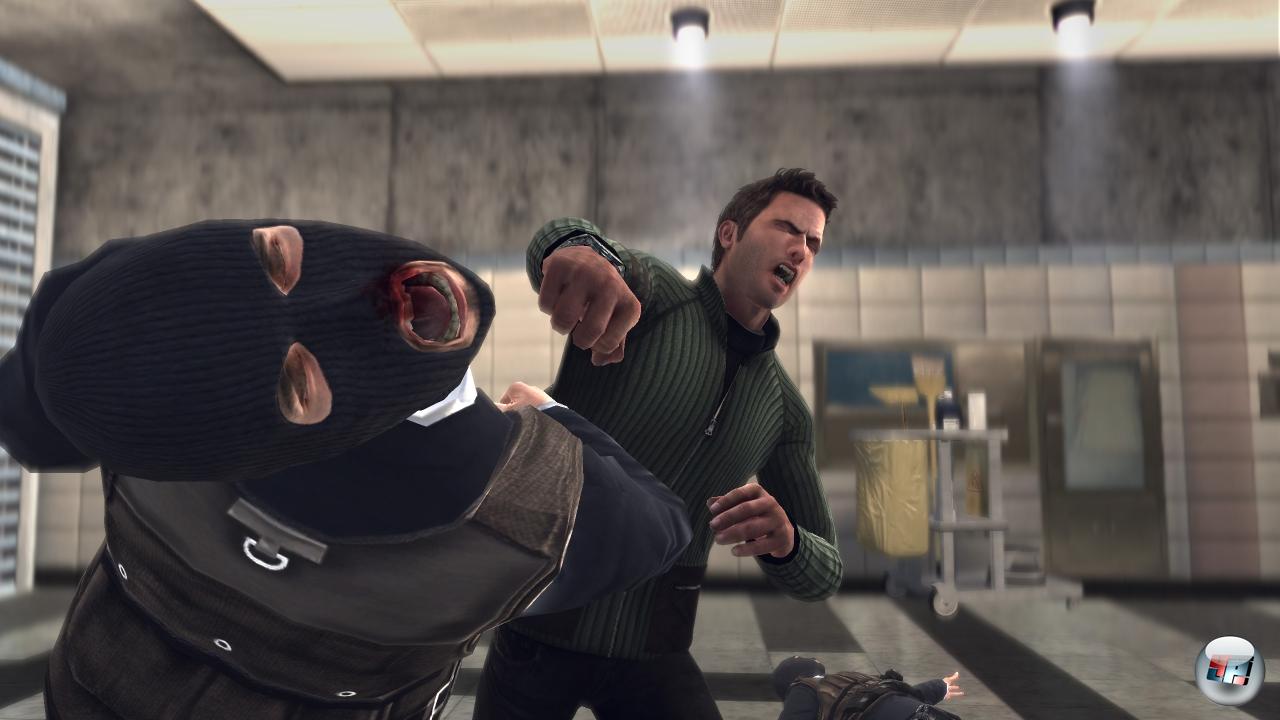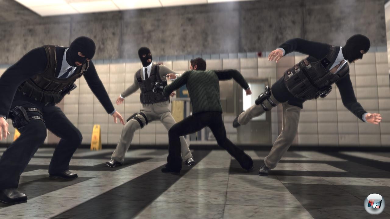 Hachja, die Takedowns. Von diesen Knockout-Manövern gibt es mehr als 300, eines brachialer als das andere: Da fliegt der Feind die Treppe runter, landet mit dem Gesicht im Kühlschrank, auf dem Tisch, auf dem Geländer oder im Kopierer, gelegentlich findet ein Feuerlöscher oder ein gut gezielter Ellbogen seinen Weg in feindliche Zähne. Ich könnte seitenweise Beispiele für Umgebungs-Takedowns geben, denn prinzipiell ist jedes Objekt im Spiel für einen Takedown zu gebrauchen. Mit erfolgreichen Prügeleien baut ihr Adrenalin in drei Stufen auf, ein flotter Druck auf die B- bzw. Kreis-Taste löst den Takedown aus, der dann automatisch abgespielt wird. Und zwar so wunderbar brachial, dass ich beim Spielen von Bourne genauso gegackert und Luft durch die Zähne gezogen habe wie beim Schauen von »Ong-Bak«.