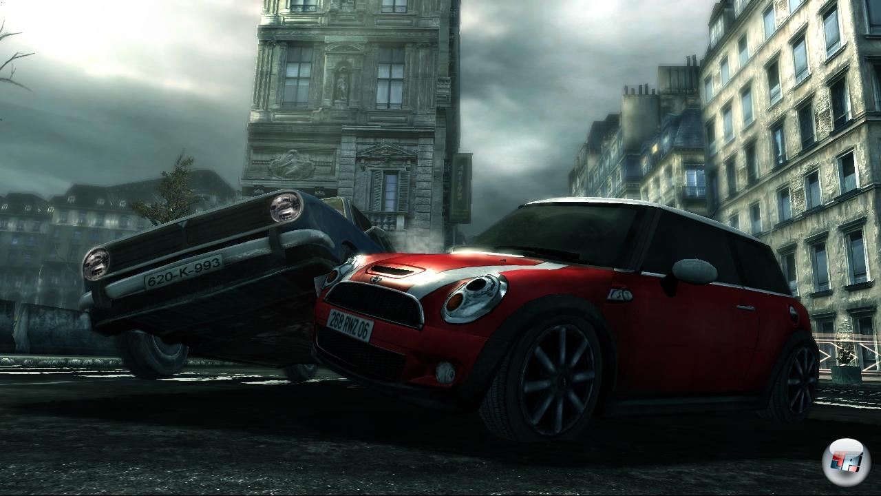 Freunde von abwechslungsreichem Missionsdesign dürften hier kaum glücklich werden, sind die Aufträge doch größtenteils nach ähnlichem Muster aufgebaut: Ihr kämpft euch zu einem Ziel vor, übersteht ein (meist großzügiges) Zeitlimit und verbiegt die Nase eines Bosses – im nächsten Level dann das gleiche Spiel von vorn. Klingt einfallslos, ist es aber nicht, denn locker eingestreute Herausforderungen halten den Puls oben: Mal müsst ihr einen mitteldicken Panzer ausschalten, mal dem Fadenkreuz einen konkurrierenden Assassinen ausweichen. Und dann gibt es natürlich noch die Fahrmission, die bereits in der Vorschau mit hochgezogener Augenbraue angesprochen wurde: Am Steuer von Maries Mini (übrigens das neue Modell, nicht das im Film verwendete Original) hetzt ihr durch Teile von Paris, auf der Flucht vor der Polizei und durch alles hindurch, was nicht aus Stein ist. Okay, die Zerlegbarkeit der Umgebung ist wirklich spaßig, aber das ist auch das einzig Positive an diesem dankbarerweise sehr kurzen Level. Das Vehikel steuert sich, als bestünden die Räder aus Seifenblasen, Marie gibt immergleiche Kommentare ab, während ihr einen Checkpunkt nach dem anderen abhakt – was nicht mal nötig wäre, denn die Strecke ist trotz aller Abkürzungsmöglichkeiten linearer als ein Lineal.