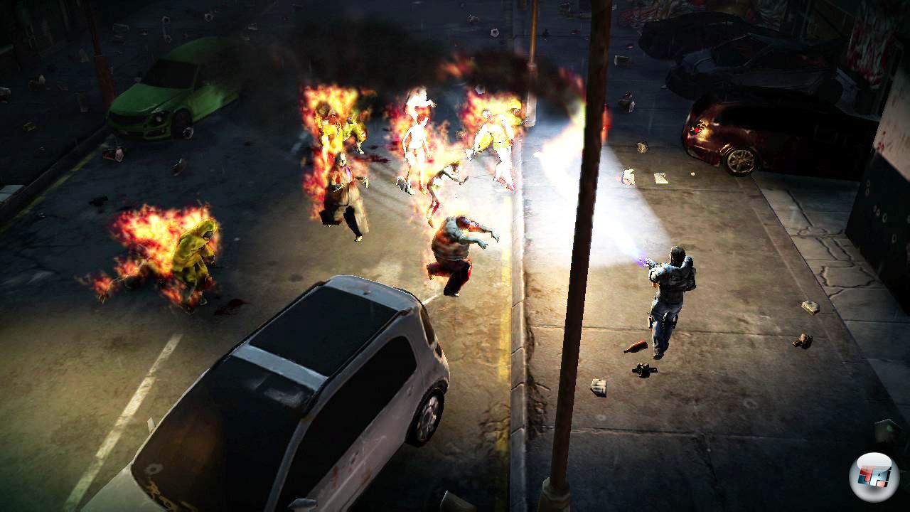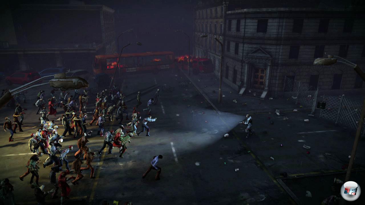 Trotzdem kommt die Taktik im Gelände sowie der Waffenwahl nicht zu kurz: Manchmal lohnt es, sich gezielt mit dem Rücken zur Wand in eine Sackgasse zu flüchten – vor allem, wenn man eine voll geladene Schrotflinte oder eine Klingenkanone besitzt, die quasi alles in vorderer Front köpft. Aber was macht man in einem Park? Ähnlich wie in Left4Dead kann man Autos anschießen und beobachten, wie die jaulende Alarmanlage die Zombies anlockt – ideal, um einen großen Pulk zusammen mit der Karre in die Luft zu jagen. Man kann sich quasi eine Route von Auto zu Auto bahnen, um die Zombies ins Verderben zu locken. Und die Explosionen sehen einfach klasse aus! Die Untoten reagieren auch auf Licht: Wer eine Leuchtfackel zündet, wird sie in Scharen dorthin strömen sehen – ideal, um danach eine Granate zu werfen. Ansonsten sollte man auf Heilpakete achten, um die Gesundheit aufzufrischen.