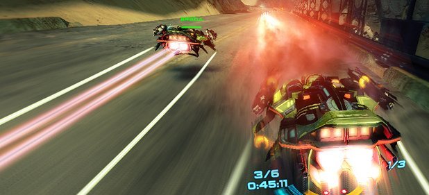 Von solchen Oberflächlichkeiten sollte man sich aber nicht ablenken lassen, denn hinter der hausbackenen Fassade steckt ein passabler Racer. Das Design von Gleitern und Fahrrinnen ist deutlich besser gelungen als die repetitiven Hintergründe: Hübsch pulsierende Neon-Leuchten sorgen sofort für WipEout-Stimmung. Ähnlich wie im Vorbild versucht man, sich mit seinem schwebenden Gleiter elegant durch moderne Kulissen zu schlängeln. Eine Luftbremse gibt es nicht – stattdessen reagiert der Analogstick etwas empfindlicher.