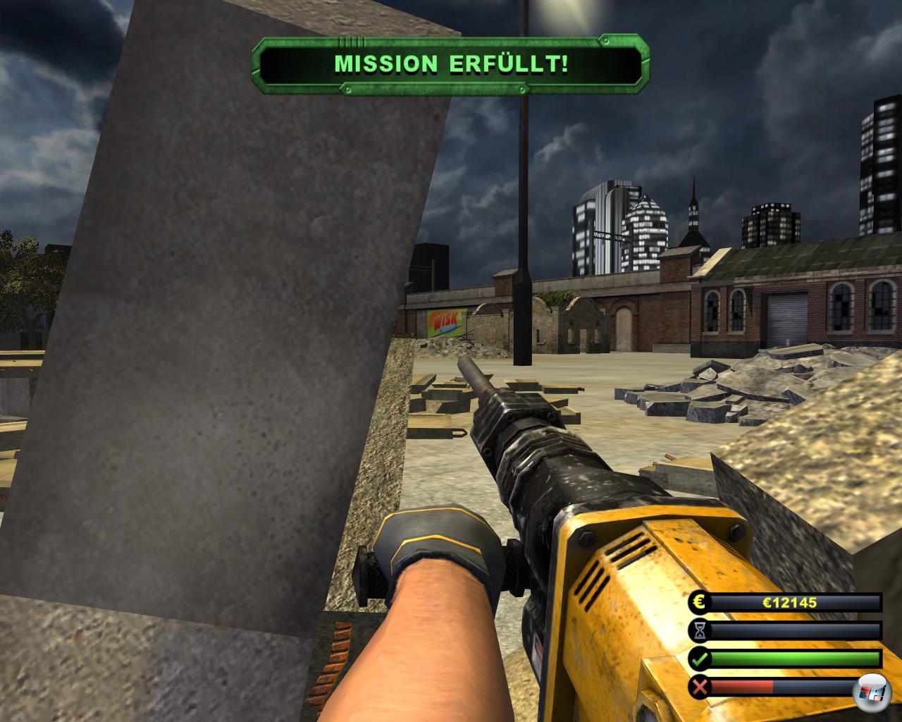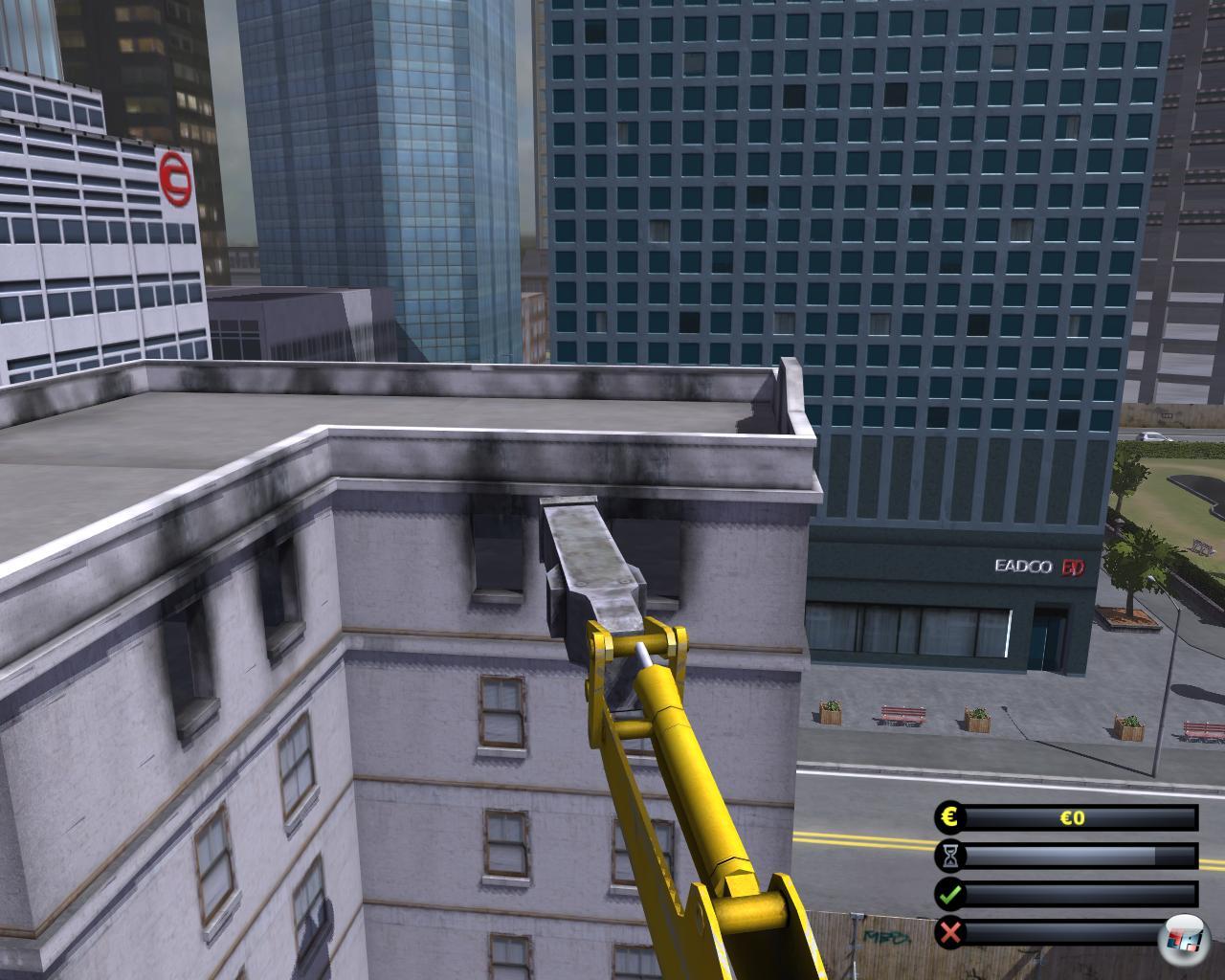 Doch mit denen kann man schon ordentlich Verwüstung anrichten und so darf ich mich auf meinem ersten Auftrag in der Altstadt dieser namenlosen Stadt austoben, die künftig mein Spielplatz sein wird. Ein mehrstöckiges Gebäude soll für den Abriss vorbereitet werden: Dazu müssen sämtliche mit Sprühfarbe markierten Mauern per Vorschlaghammer zum Einsturz gebracht werden. Klingt nicht so prickelnd? Ist es auch nicht. Ich latsche von Stockwerk zu Stockwerk, klicke wie blöde auf die betreffenden Mauern, die dann zerbröseln – wenn ich Glück habe, fallen auch schon mal größere Brocken am Stück um. Die größte „Herausforderung“ liegt darin, an einigen Stellen versteckte Häufchen von Altmetall einzusammeln, die sich dann als zusätzlicher Bonus auf meinem Konto bemerkbar machen. Wie ich da so durch die Stockwerke husche, fühle ich mich an das gute alte CS 1.0 erinnert allerdings hat das mittlerweile gut zehn Jahre auf dem Buckel. Oben lass ich mich dann „aus Spaß“ mal vom fünften Stock fallen und was passiert? Gar nix…kein „Uff“, kein rotes Aufleuchten des Bildschirms, kein Abnehmen irgendeiner Gesundheitsanzeige, wie auch? Es gibt ja keine. Da fallen mir die Worte…ähhh Moment – es gibt ja keine Sprachausgabe – also der Text, aus einem Info-Kasten während des Tutorials ein: „Die Bauarbeiter in Demolition Company tragen alle Spezialhelme, mit denen sie vor Unfällen jeder Art geschützt sind“. Aha, auch vor Stürzen aus 50 Meter Höhe? Interessant. Nun denn, nach etwa acht Minuten ist der erste Auftrag absolviert, mein Konto um 4000 (leider nur virtuelle) Euro reicher und meine Erfahrungswerte von 0 auf 900 gestiegen. Im Folgeauftrag soll ein kleines Gebäude auf dem Dach des Hauses mit dem Presslufthammer eingerissen werden. Hier kann erstmals auch etwas falsch gemacht werden: Die Bruchstücke sollen nämlich nicht herabfallen. Geschieht dies zu häufig, füllt sich ein roter Balken und ist dieser voll, bevor die grüne Fortschrittsanzeige komplett ausgefüllt ist, gilt die Mission als gescheitert. Immerhin: Endlich ein Hauch von Herausforderung!