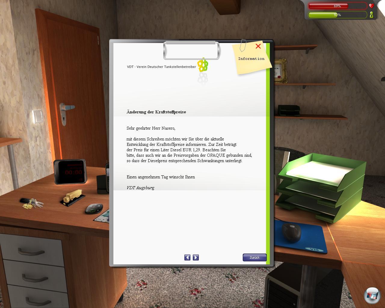freilich allein noch kein Geld bringt. Hinzu kommt eine Versicherung, die vor Schäden schützen soll. Der tägliche Papierkrieg ist also durchaus realitätsnah dargestellt, da man immer wieder Werbung, amtliche Mitteilungen und Angebote auf den Schreibtisch bekommt. Das geht sogar so weit, dass man die Rechtsform seiner Firma ändern kann, was aber Geld kostet. Viele der Schreiben landen im Müll, aber auf ernste Angebote muss ein redlicher Kaufmann reagieren: So schickt man einen Kostenvoranschlag brav zurück, worauf der Transportvertrag zustande kommt.